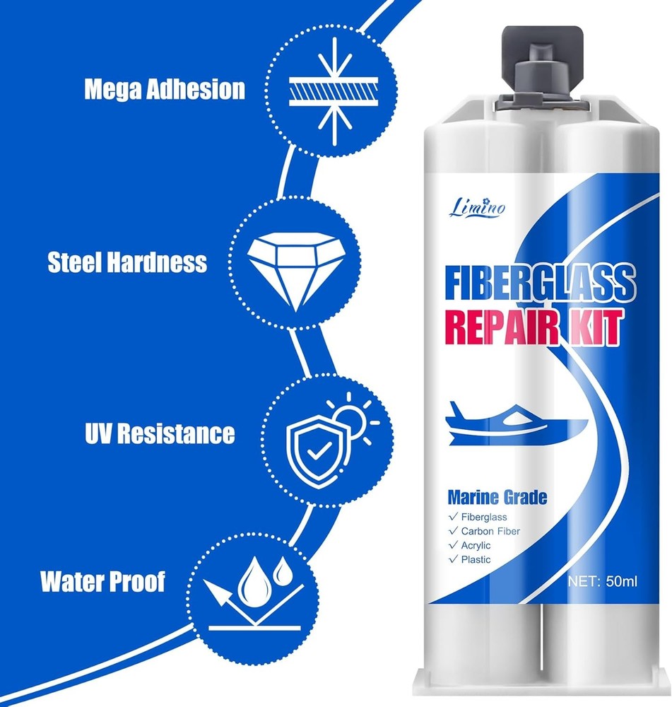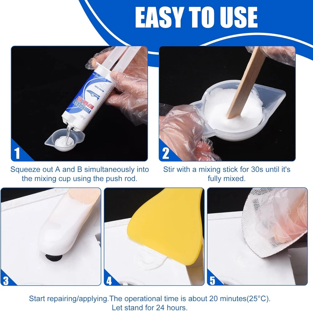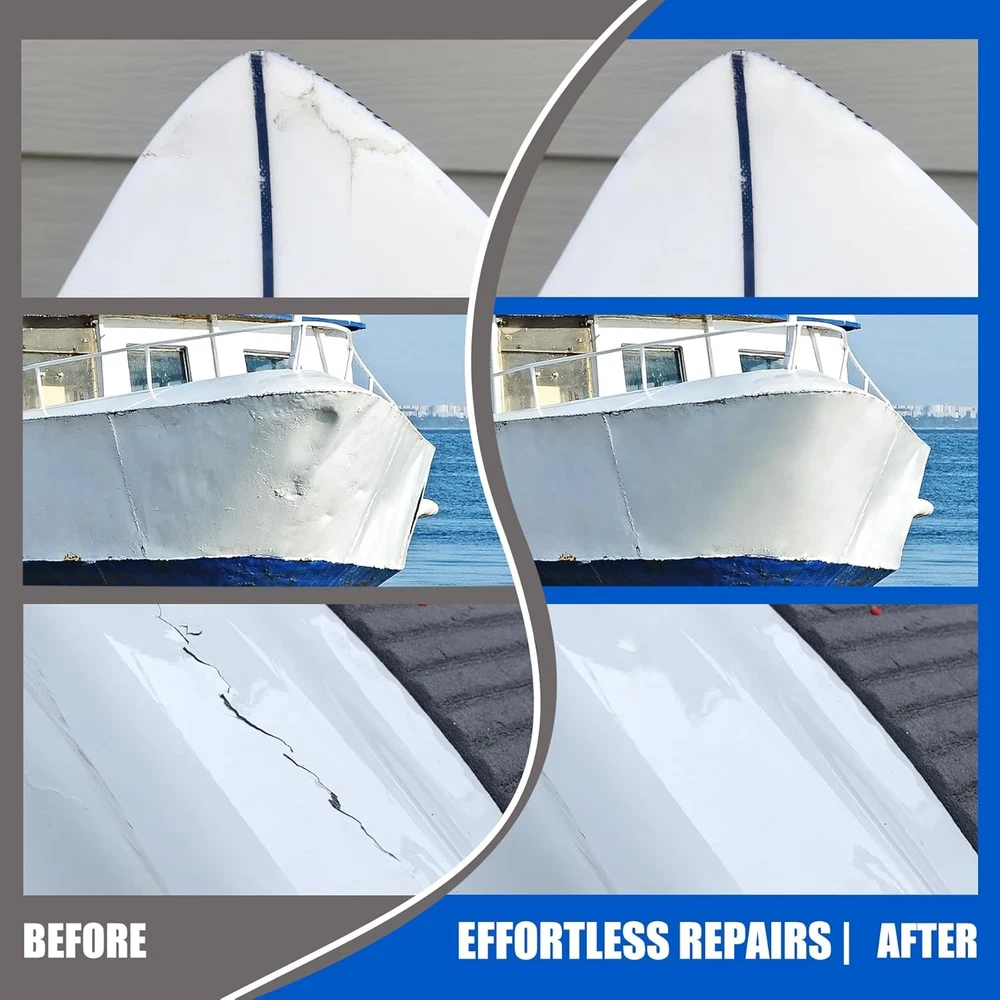 SPECIALIZED FIBERGRASS KIT - Our marine fiberglass repair kit has mega adhesion to effectively repair fiberglass boat damage on horizontal and vertical surfaces (Above The Waterline), perfectly repairing scratches, cracks and holes on the boat. Excellent UV resistance and waterproof protection, specially designed to cope with exposure to sunlight and humid environments, making it suitable for various types of boat repair tasks such as motorboats, surfing boats, kayaks, yachts, sailboats, canoes. VARIETY OF APPLICATIONS - The gelcoat repair kit has good compatibility with surface damage repair of fiberglass, carbon fiber, acrylic, plastic, porcelain, stainless steel, stone, aluminum and other materials. Not even for boat, if you encounter the above materials you need to repair in your life, use this product to started doing a bunch of small repairs around the house immediately. DURABLE AND LONG-LASTING QUALITY - We use two-component fiberglass filler for detachable open packaging, ensuring the activity of the product during storage and its reusability. With outstanding mega adhesion, it can ensure the perfect fit between the adhesive and the repaired wound, and maintain a steel like hardness and toughness for a long time. It is a perfect marine fiber glass simple repair kit. SIMPLY TO USE - The marine fiberglass repair kit equipped with complete accessories, we use the push rod to squeeze out A and B simultaneously into the silicone cup. After 30s mixing, start repairing and applying. The operational time is about 20 minutes (25℃). Fully curing time is 24 hours. When it solidifies, its hardness is as hard as steel. So we equipped sandpaper to polish the surface for better fusion effect. ECONOMICAL AND PRACTICAL - The same expenditure can achieve greater capacity without sacrificing quality. If you are not satisfied with your purchase or if it arrives damaged, don't hesitate to reach out to us. Click 'Add to Cart' now and enjoy the journey of perfect repair experience.