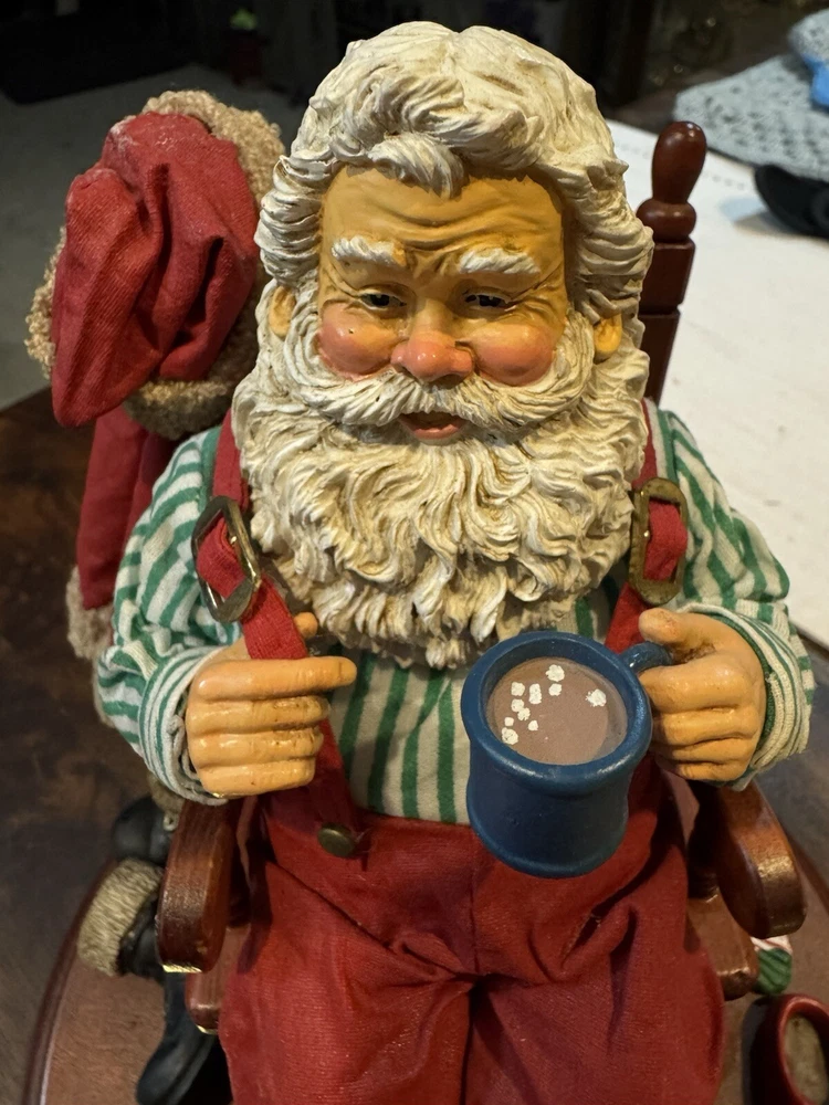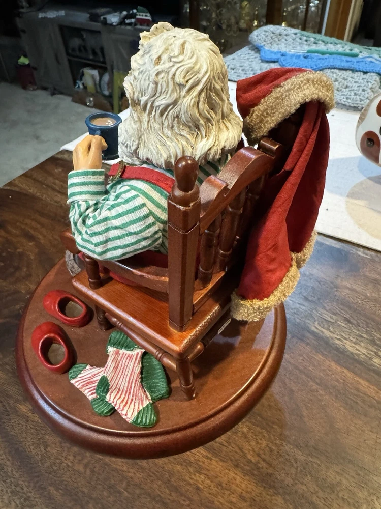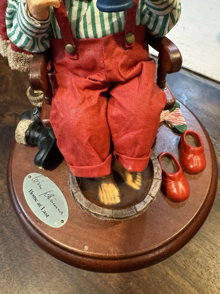 Potpourri Press Christmas Traditions Home At Last is a vintage Fabric Mache Santa depicting a festive scene. Manufactured in Taiwan in 1991, this holiday collectible features a mix of red, white, green, brown, and black colors, celebrating the Christmas occasion.