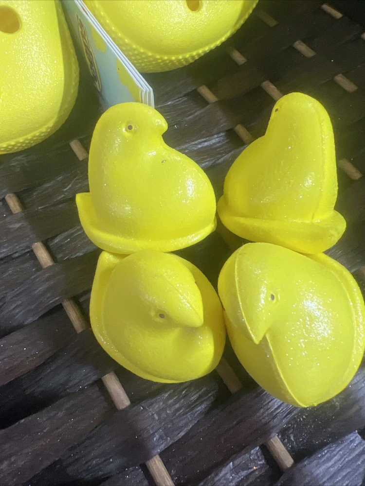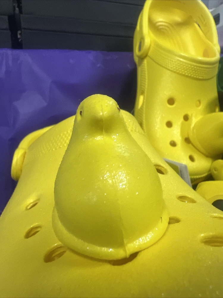 Add some Easter cheer to your Crocs with this limited edition marshmallow Peeps Jibbitz shoe charm. The bright yellow color and fun Peep character design make it a must-have for any Crocs enthusiast. Made from water-resistant materials, this shoe charm is perfect for keeping your Crocs looking fresh and cute. The charm is compatible with all Crocs models and is easy to attach with its sturdy clip. Show off your love for Crocs and Easter with this unique and hard-to-find shoe charm. Get yours now and step up your Crocs game! These are brand new. The crocs have never been worn. We are keeping the shoes, but getting rid of some of the extra peeps. Never worn before and perfect condition. They also have a shimmer like almost glittered looking.