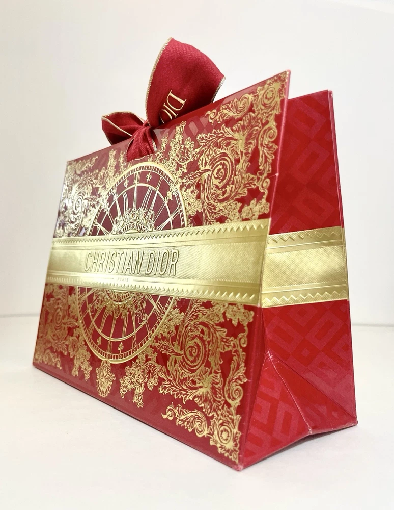 This limited edition Dior gift bag is the perfect addition to your luxury shopping experience. Measuring 7.8”x5.8”x2.8”, it is made of high-quality cardboard, cloth, and paper materials, and features a stunning red and gold color scheme. Whether you're celebrating an occasion or simply want to add some extra touch to your gifts, this Dior gift bag is the way to go.