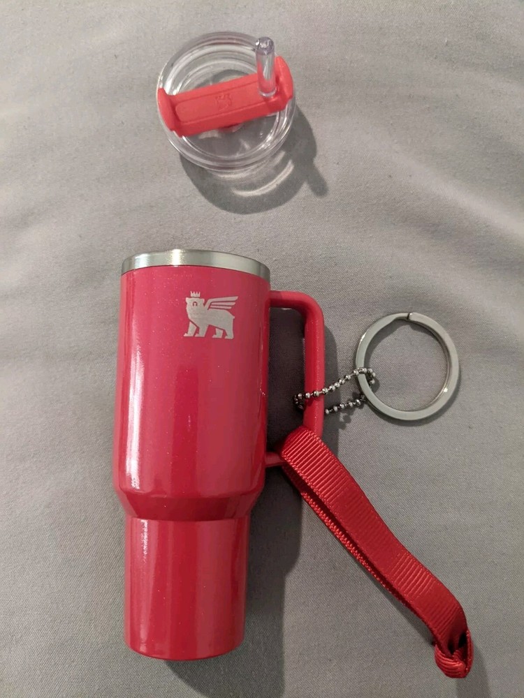 This limited edition Stanley Mini Quencher Ornament Keychain in Red Delicious features a modern design with a red color scheme. Made of plastic, it includes a keychain attachment for convenience and is themed after Stanley tumblers. Perfect for collectors or those seeking a stylish and functional key accessory.