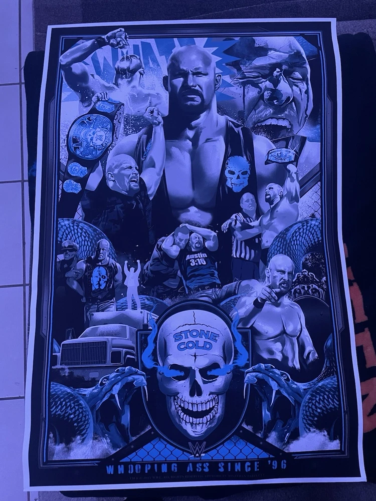 Limited Edition Stone Cold Steve Austin 25th Anniversary 24x36 Art Print Blue By Jonathan Bartlett Only 316 made in blue