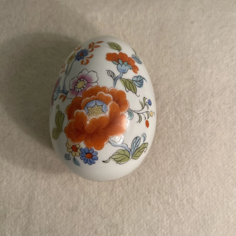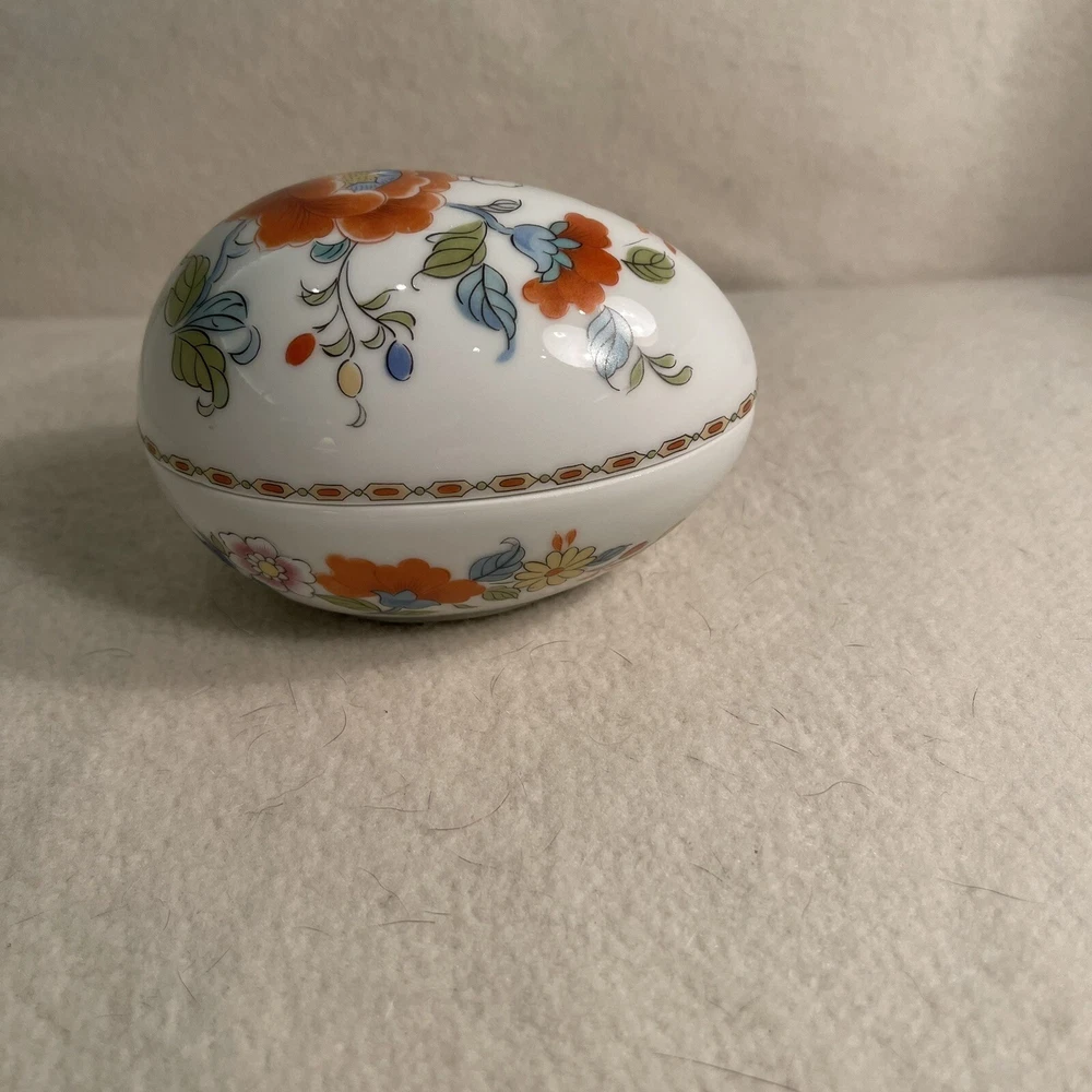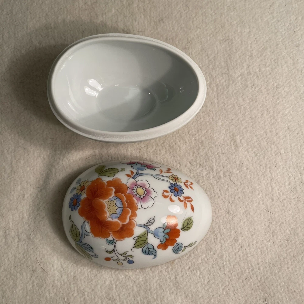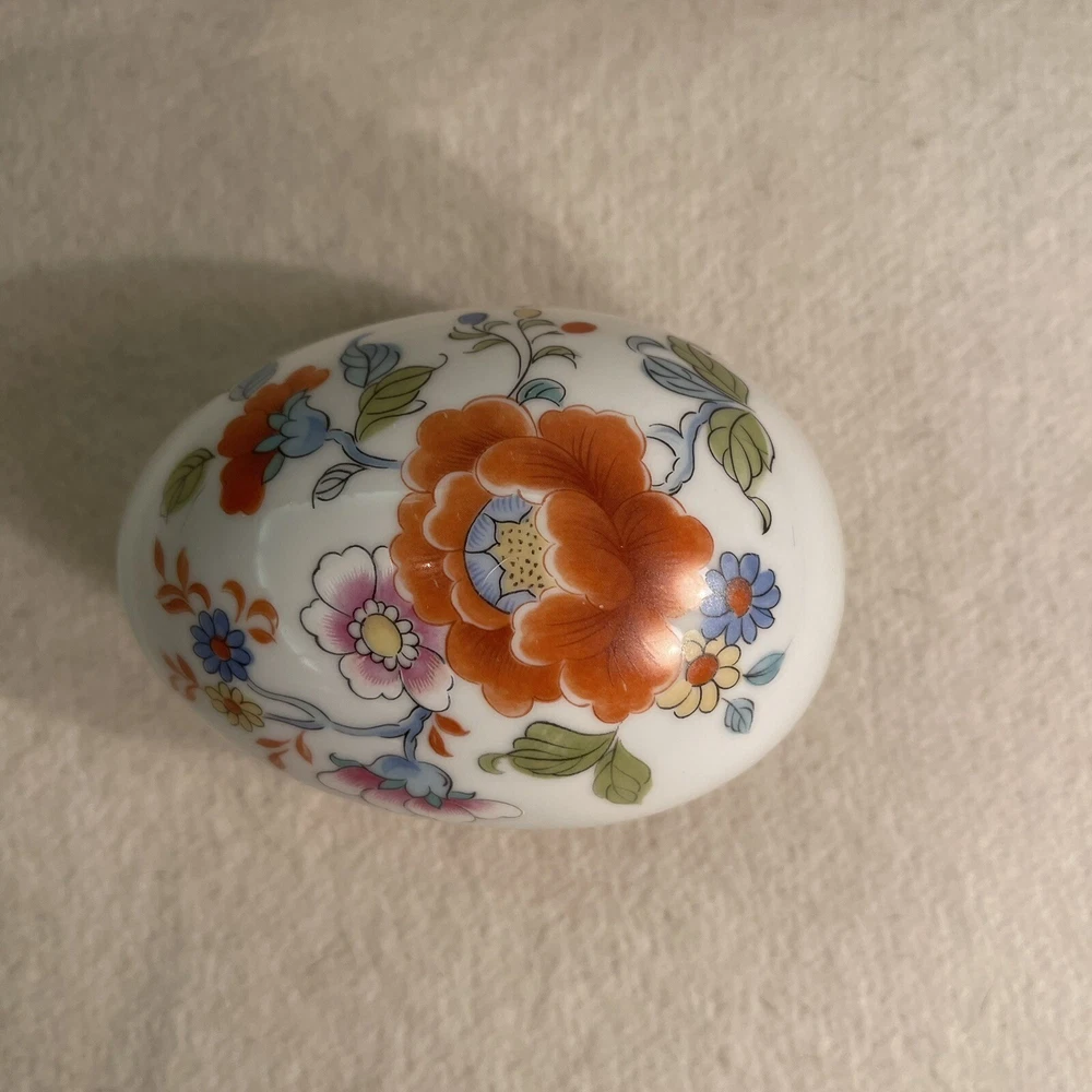 This Limoges France Porcelain Egg Shaped Trinket Box features a beautiful hand-painted floral design, making it a charming decorative piece for all occasions. The oval-shaped box is crafted from high-quality porcelain with a glossy finish, showcasing intricate French style. Measuring 4.5 inches in length, 3 inches in height, and 3 inches in width, this original 1980s piece from France is a unique collectible item that weighs 6.5 ounces. Excellent condition. No chips or cracks.