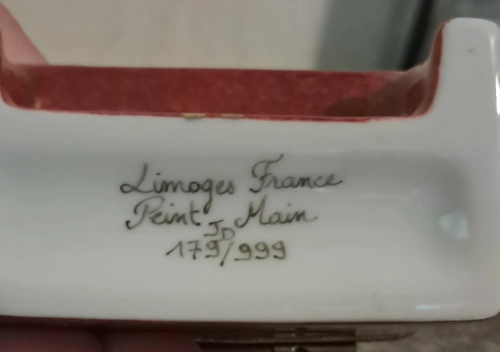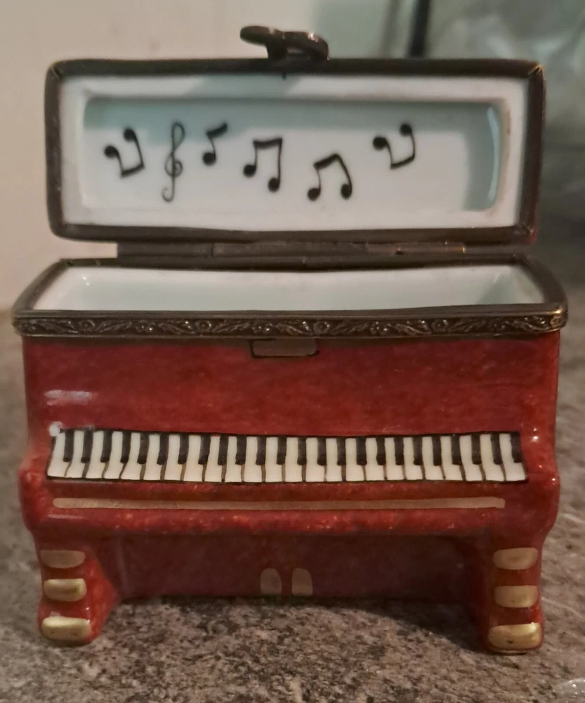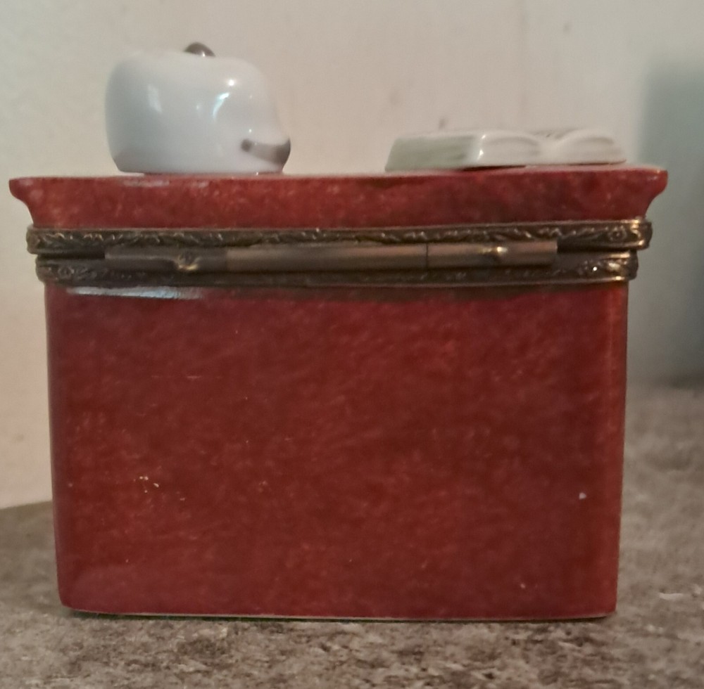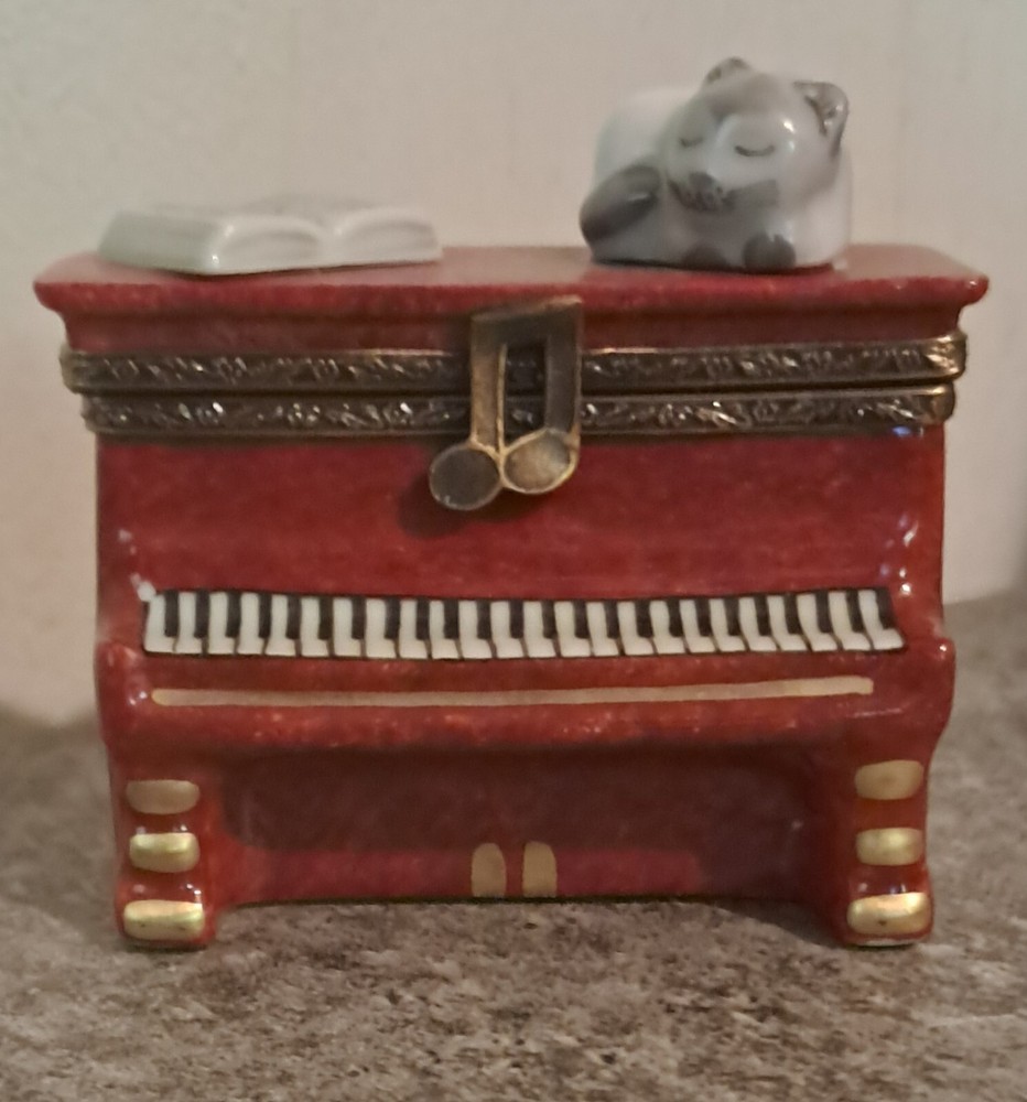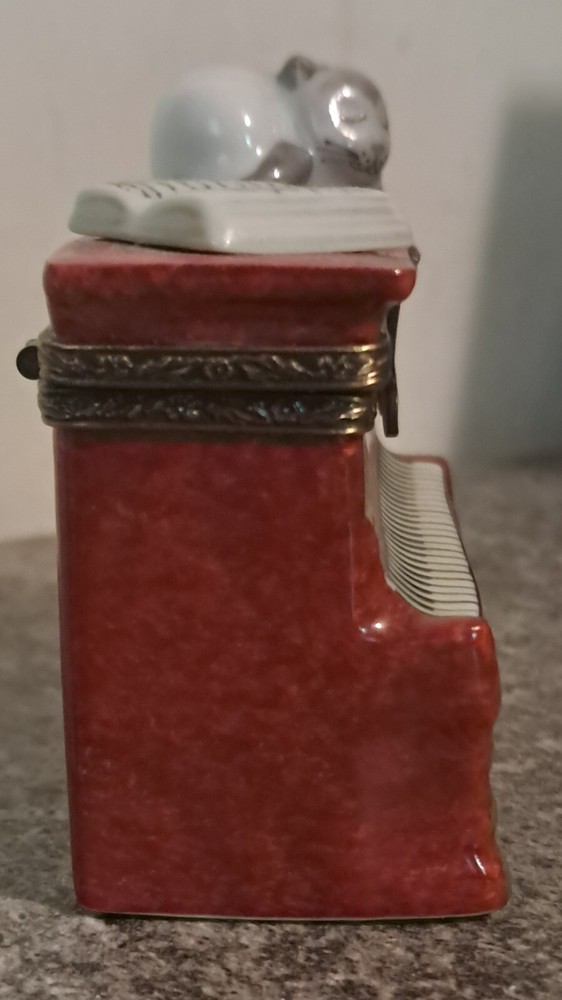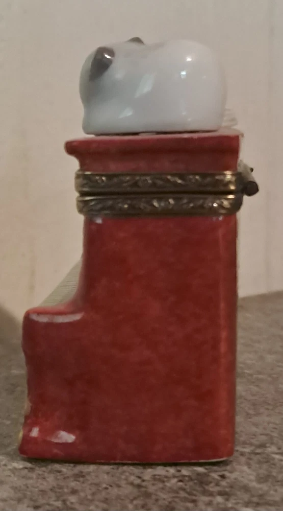 The Limoges trinket box piano with cat and book is a charming and whimsical collectible item featuring intricate details and a unique design. The trinket box takes the shape of a book, making it a creative and playful addition to any collection. With a piano and cat as the main subjects, this collectible is sure to stand out and bring joy to its new owner. The boxed packaging adds a touch of luxury to this decorative piece, making it a perfect gift for any cat lover or avid collector.