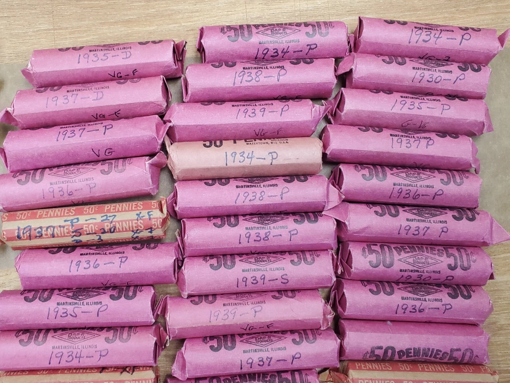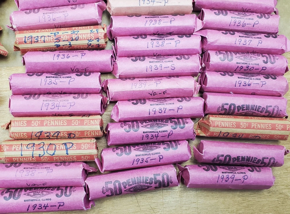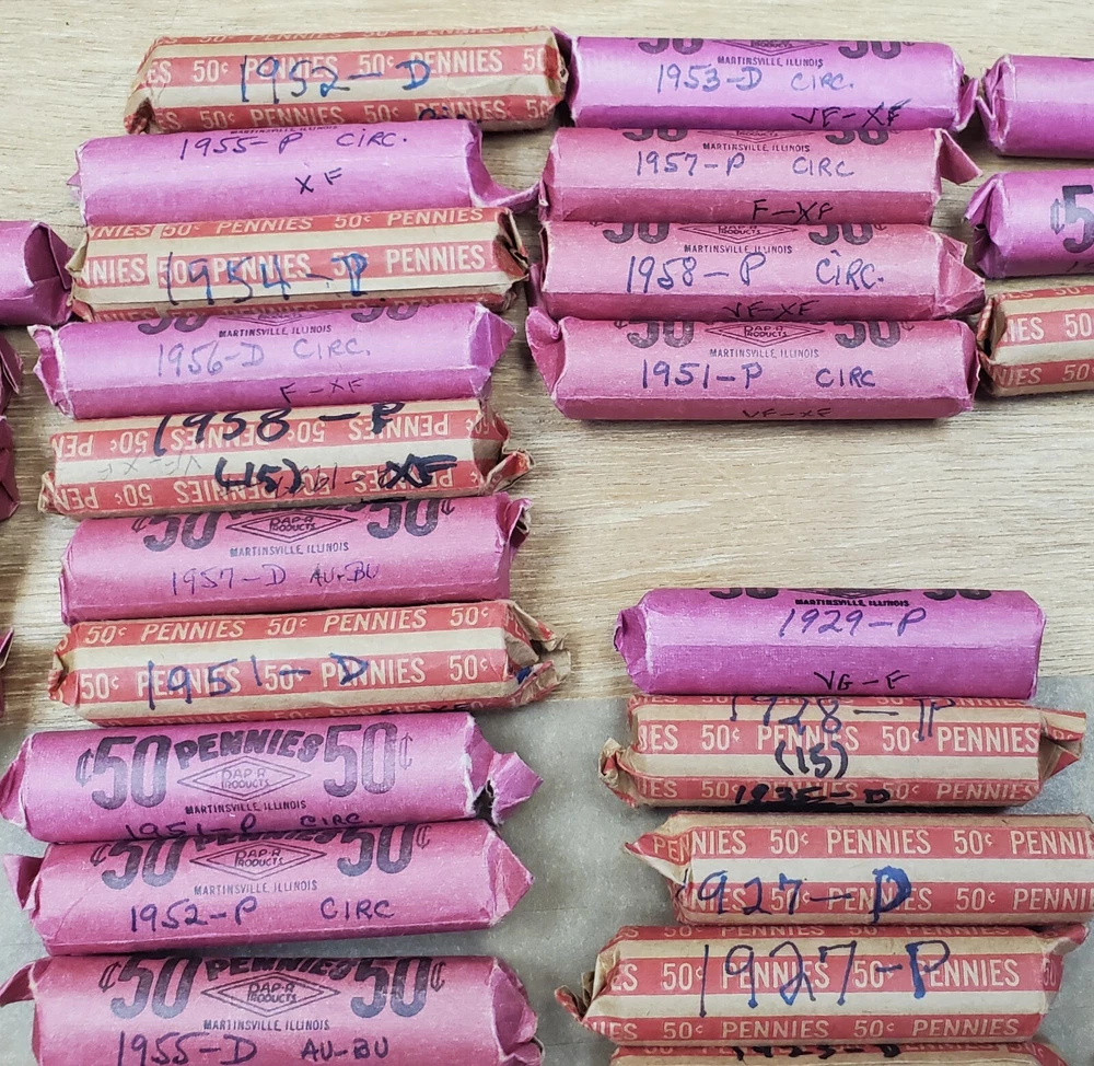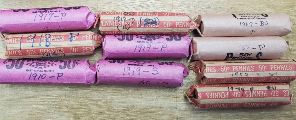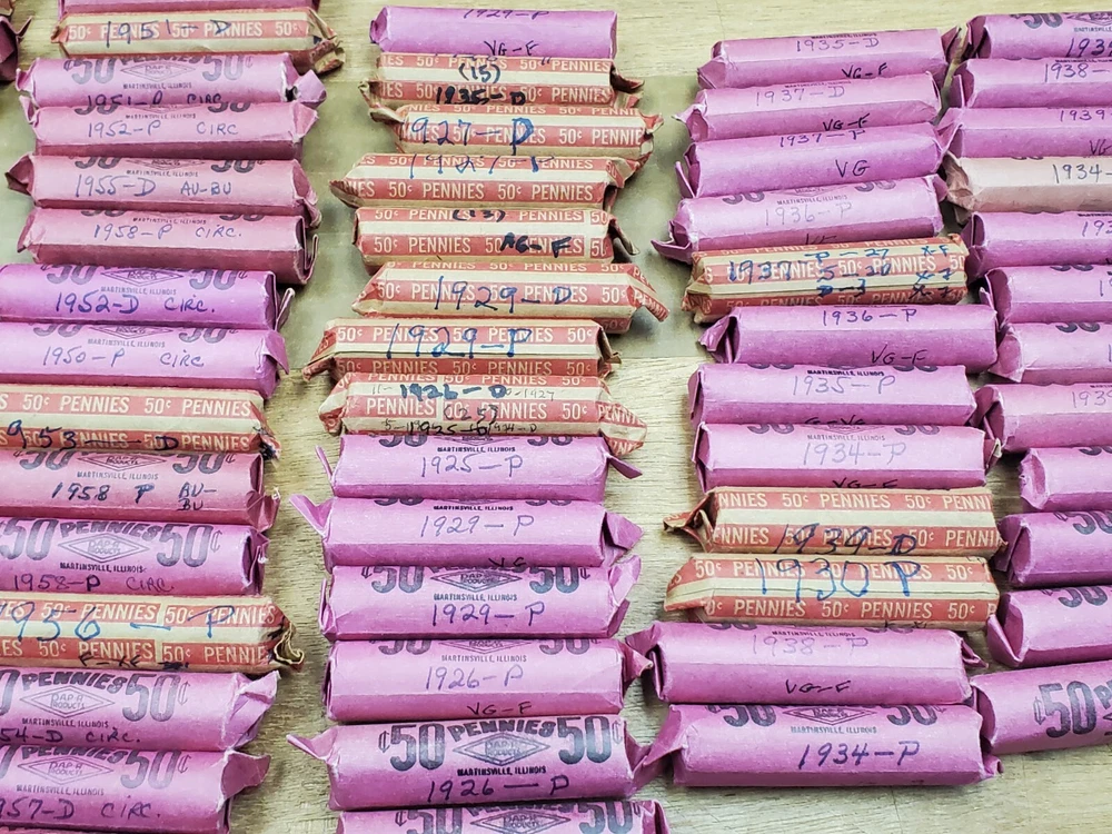 This is a Huge Lot of 139 Rolls from a Large Estate Collection. We had opened a few rolls to verify the contents, and we did find a Indian Head Cent in one and a few BU Uncirculated Wheat Pennies and Steel Pennies, but who know what you will find in the rest of these rolls. PLEASE NOTE: (4) x Rolls are Not Wheat Cents in this Lot The are from the 60' and 70's Listed below. What's Included - all rolls pictured and Listed here. 1910's x 6 Rolls 1920's x 14 Rolls 1930's x 36 Rolls 1943 x 43 Rolls 1950 x 36 Rolls 1960's x 2 Rolls 1970's x 2 Rolls *** INTERNATIONAL SHIPPING QUOTED*** Thank you for viewing... Please email any questions you may have.... Take a moment and check out our other unique auctions !!! ***** Email us about signing up for our mailing list******* Exciting new items every day Philately - The Quiet Excitement Shipping We try to Ship Within 5 Business Days of Cleared Payment Will calculate international shipping PLEASE READ International Buyer's Shipping Instructions International shipping "" First Class Registered ENVELOPE " NO EXCEPTIONS ! ** Insurance, Registered mail or Confirmation/Signature Guarantee is included in the price of shipping for the USA only ** Our goal is to please our customers, provide quality and unique items, have successful transactions and earn positive feedback with a 5 star rating. We strive for accurate descriptions, quick turnaround, detailed communication, and reasonable shipping charges on every lot. Your feedback is important to us. If you feel anything about the transaction was less than 5 star, please give us the opportunity to rectify the situation Thank you The Staff at Henry Gitner Philatelists, Inc.