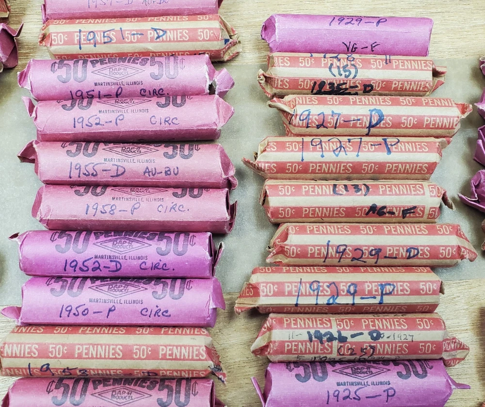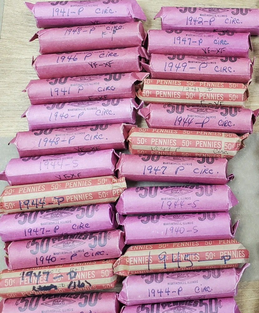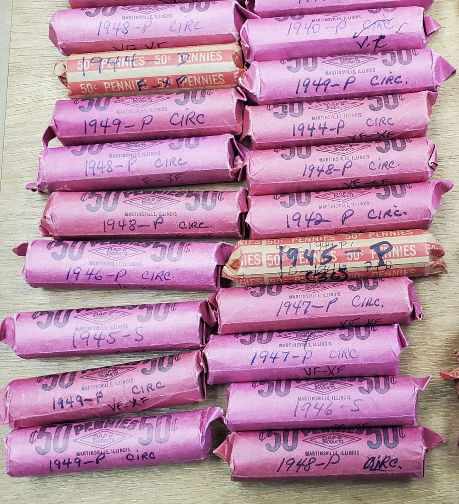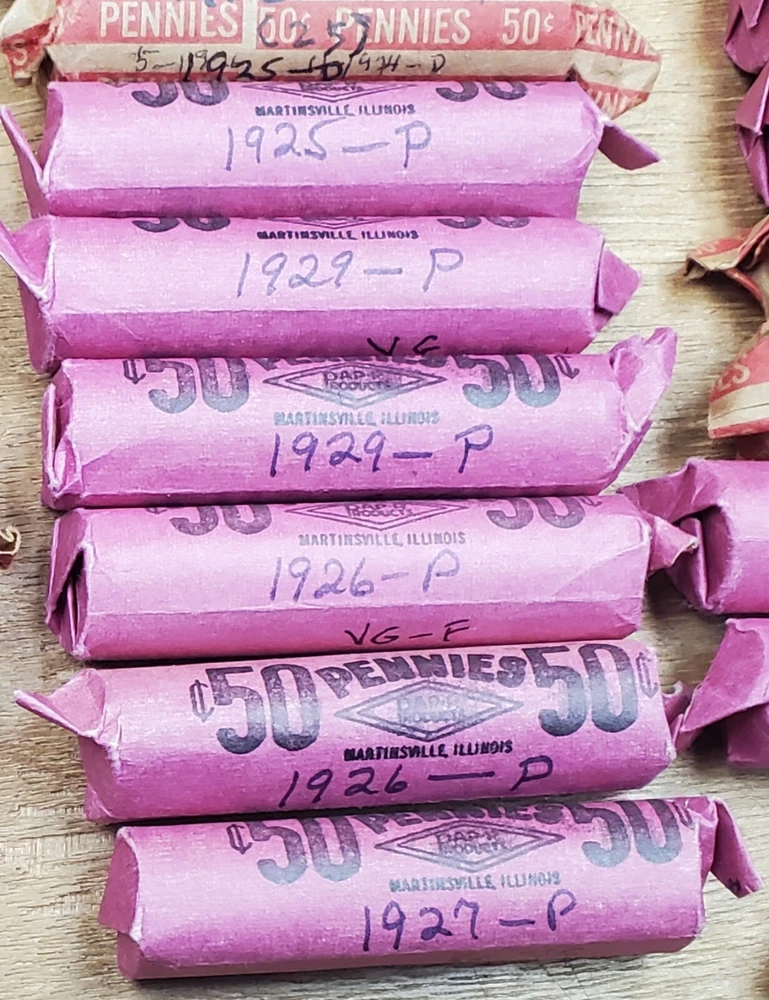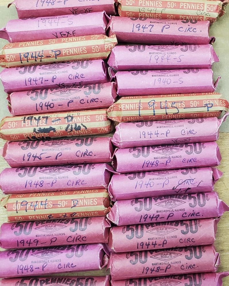 This is a Huge Lot of 139 Rolls from a Large Estate Collection. We had opened a few rolls to verify the contents, and we did find a Indian Head Cent in one and a few BU Uncirculated Wheat Pennies and Steel Pennies, but who know what you will find in the rest of these rolls. PLEASE NOTE: (4) x Rolls are Not Wheat Cents in this Lot The are from the 60' and 70's Listed below. What's Included - all rolls pictured and Listed here. 1910's x 6 Rolls 1920's x 14 Rolls 1930's x 36 Rolls 1943 x 43 Rolls 1950 x 36 Rolls 1960's x 2 Rolls 1970's x 2 Rolls *** INTERNATIONAL SHIPPING QUOTED*** Thank you for viewing... Please email any questions you may have.... Take a moment and check out our other unique auctions !!! ***** Email us about signing up for our mailing list******* Exciting new items every day Philately - The Quiet Excitement Shipping We try to Ship Within 5 Business Days of Cleared Payment Will calculate international shipping PLEASE READ International Buyer's Shipping Instructions International shipping "" First Class Registered ENVELOPE " NO EXCEPTIONS ! ** Insurance, Registered mail or Confirmation/Signature Guarantee is included in the price of shipping for the USA only ** Our goal is to please our customers, provide quality and unique items, have successful transactions and earn positive feedback with a 5 star rating. We strive for accurate descriptions, quick turnaround, detailed communication, and reasonable shipping charges on every lot. Your feedback is important to us. If you feel anything about the transaction was less than 5 star, please give us the opportunity to rectify the situation Thank you The Staff at Henry Gitner Philatelists, Inc.