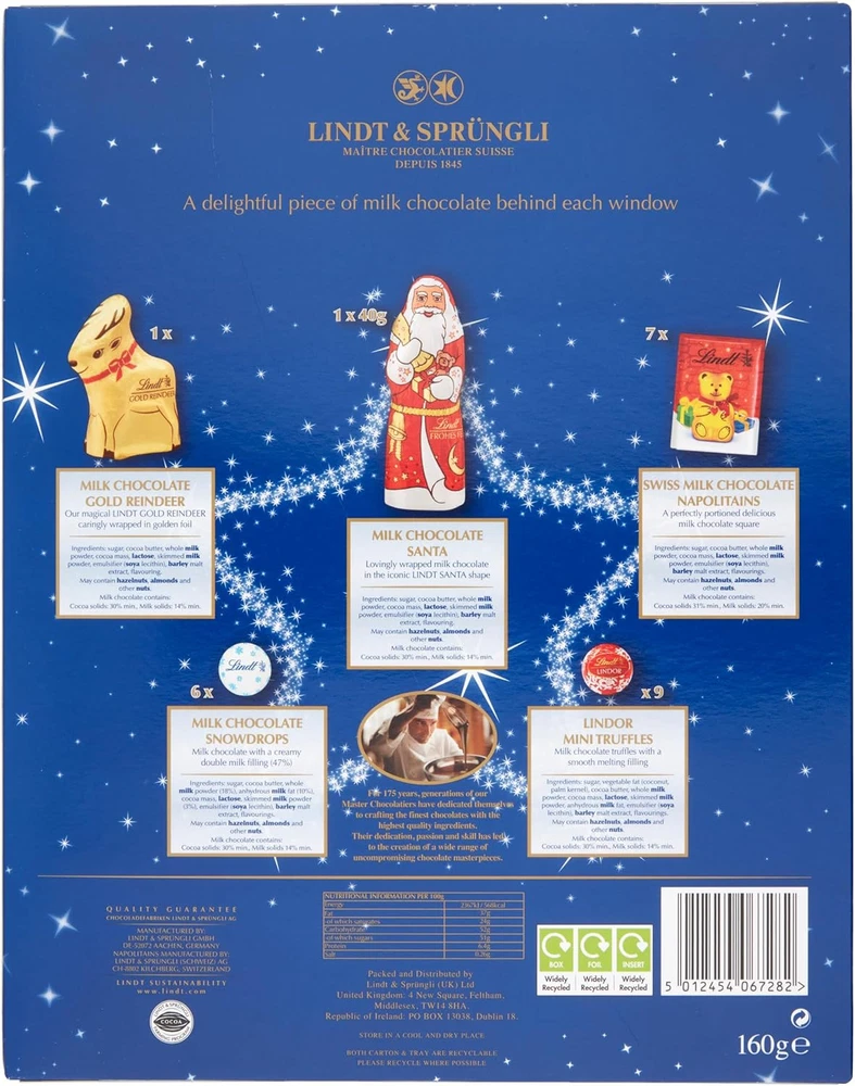 Lindt Advent Calendar - 160G 5.64 Ounce (Pack of 1), blue Product Details Manufacturer: Lindt And Sprungli Ltd Brand: Lindt Item Weight: 10.3 ounces Product Dimensions: 1.34 x 10.71 x 13.39 inches Item model number: 107609641 Is Discontinued By Manufacturer: No Color: blue Material Type: Cocoa Size: 5.64 Ounce (Pack of 1) Manufacturer Part Number: LK-H2XU-RNQ5 Brand: Lindt Color: blue Theme: Christmas Age Range (Description): Kid Material: Cocoa Lindt Advent Calendar - 24 assorted milk chocolate surprises for a festive countdown full of magical chocolate ocolate Containing delicious, Gold-wrapped Reindeer, Milk Chocolate Snowdrops, Lindor Mini Truffles with a smooth melting filling, iconic Lindor Santa's, as well as ideally portioned square Neapolitans to make December mornings delightful Lindt Master Chocolatiers use their 165 years of dedication and expertise in chocolate to make Christmas special Lindt Lindor Milk Lovers Advent Calendar will bring festive, magical atmosphere to any reception area Embrace the Christmas spirit with impeccably arranged Advent Calendar and share it with your beloved ones Lindt Advent Calendar - 24 assorted milk chocolate surprises for a festive countdown full of magical chocolate Containing delicious, Gold-wrapped Reindeer, Milk Chocolate Snowdrops, Lindor Mini Truffles with a smooth melting filling, iconic Lindor Santa's, as well as ideally portioned square Neapolitans to make December mornings delightful Lindt Master Chocolatiers use their 165 years of dedication and expertise in chocolate to make Christmas special Lindt Lindor Milk Lovers Advent Calendar will bring festive, magical atmosphere to any reception area Embrace the Christmas spirit with impeccably arranged Advent Calendar and share it with your beloved ones The ideal chocolate gift to show your love and bring a smile to children’s faces - even the grown-up ones