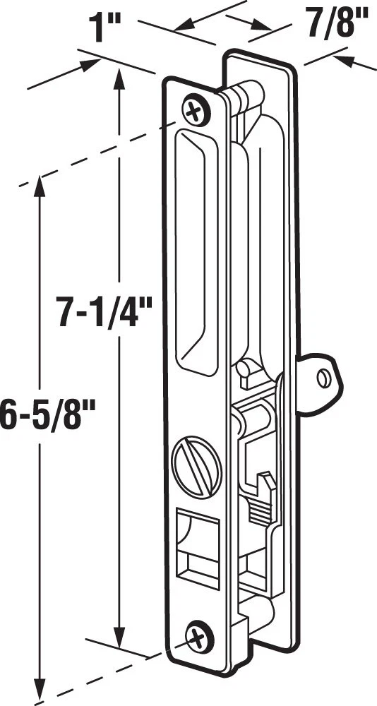 Product Description This patio door handle set is constructed of diecast and comes in a chrome plated finish. It features a keyed-locking cylinder with a night latch device, a 3/8 inch steel hook, and a 6-5/8 inch center spacing. This diecast flush latch assembly fits most popular door style cutouts. It is non-handed, and includes all fasteners necessary for installation. See -Line part C 1076 which includes an assortment of interchangeable steel hooks. From the Manufacturer This patio door handle set is constructed of diecast and comes in a chrome plated finish. It features a keyed-locking cylinder with a night latch device, a 3/8 inch steel hook, and a 6-5/8 inch center spacing. This diecast flush latch assembly fits most popular door style cutouts. It is non-handed, and includes all fasteners necessary for installation. See model number C 1076 which includes an assortment of interchangeable steel hooks. Used to replace damaged or missing flush latch assemblies on patio sliding doors 6-5/8 inch mounting hole center spacing Easy to install Diecast construction with a chrome finish See -Line part C 1076 with 4-hook assortment, and C 1215 for non-keyed
