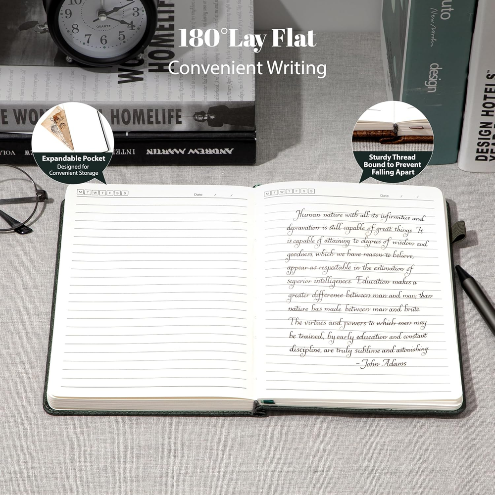 VEGAN LEATHER BOUND JOURNAL: Tree growth ring embossed with a cruelty-free vegan leather cover, the tree growth ring symbolises each person has grown up and the achievements and challenges. 5.7 x 8.3 inches, compact and easy to carry. PREMIUM QUALITY PAPER: Leather bound journal features 100 gsm 256 pages of premium acid-free paper that prevents ink bleed, erasures, ghosting and shadows while protecting your eyes. Hardcover notebook journal provides you with a good writing experience, So you can do a better job of writing or creatin LAY FLAT DESIGN: Our writing journal is designed to lay flat, making it easier to write with either hand, The elastic closure design helps protect your content. A ribbon bookmark inside makes it easy to keep track of queries and the pocket design for cards, receipts, or other small, scattered items, making it easy to organize your things. VERSATILE USE -- This A5 notebook is ideal for office, school and home use, and is a great gift choice for women, men, business executives, college, students and people in many other fields. This 5.7 x 8.3 inch journal can be carried around in a bag and is also a good helper for your travel records, meeting all your needs. CAGIE BRAND SUPPORT: You can purchase our products with full confidence! if you don't love the journal notebook due to any quality issues, simply directly within 1 year and we will send you a hassle-free replacement journals for wroting or full refund. Product Description