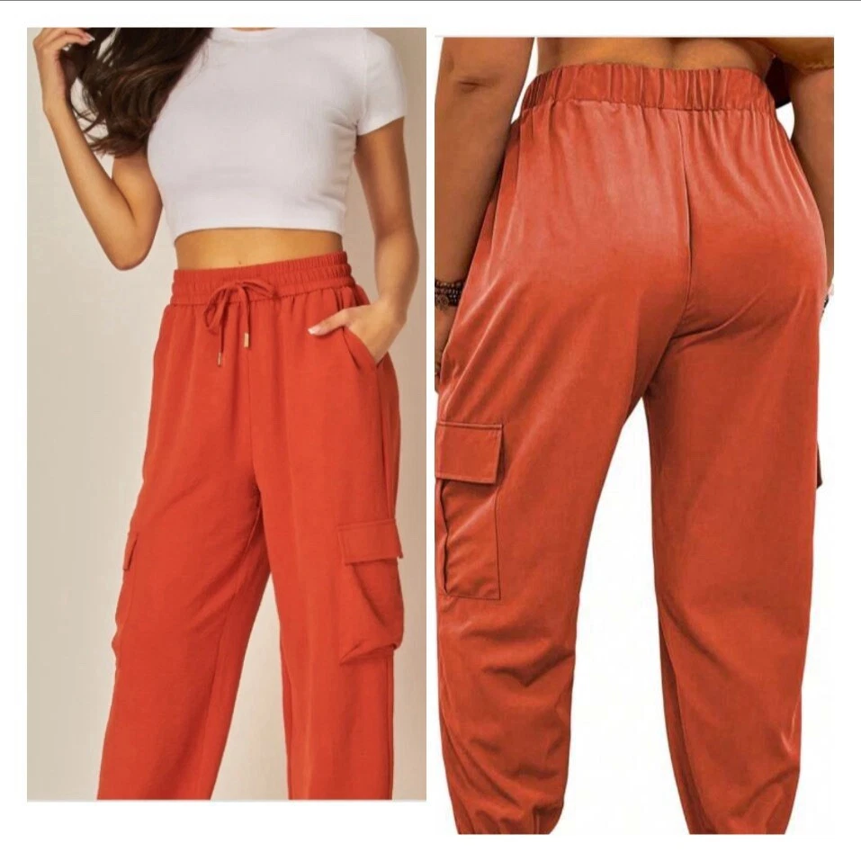 These Linen Blend Cargo Joggers in size M feature a relaxed fit with a tapered leg style. They come in a vibrant orange color with gold accents, perfect for casual or travel occasions. The pants have an elastic waist with drawstring closure, and include pockets for convenience. Made from a blend of viscose and linen, they are machine washable and suitable for all seasons.