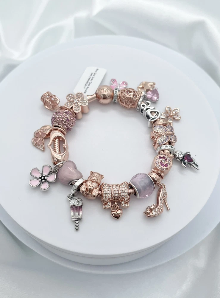 Linx rose gold snake chain style charm bracelet in 18 K rose gold over 925 sterling silver, with a ball clasp, featuring the signature Linx logo. This bracelet is sure to become a cherished part of your jewelry collection. Size 7.5. Sizes 6.3, 6.7, 7.1, 7.9, and 8.3 are also available. Should you require one of these sizes, please message us and we can create a custom listing for you in your requested size. Bracelet comes with 1 Pandora and 19 Linx charms and 18 K rose gold over 925 Sterling silver and 925 sterling silver. Linx pieces are excellent quality! All items are new and ship directly from Linx Jewelry Company The bracelet will Include a Luxury, velvet, anti tarnish jewelry pouch and Linx Sterling silver polishing cloth.