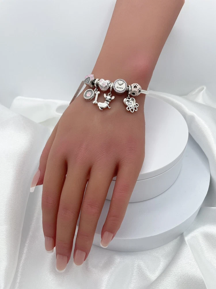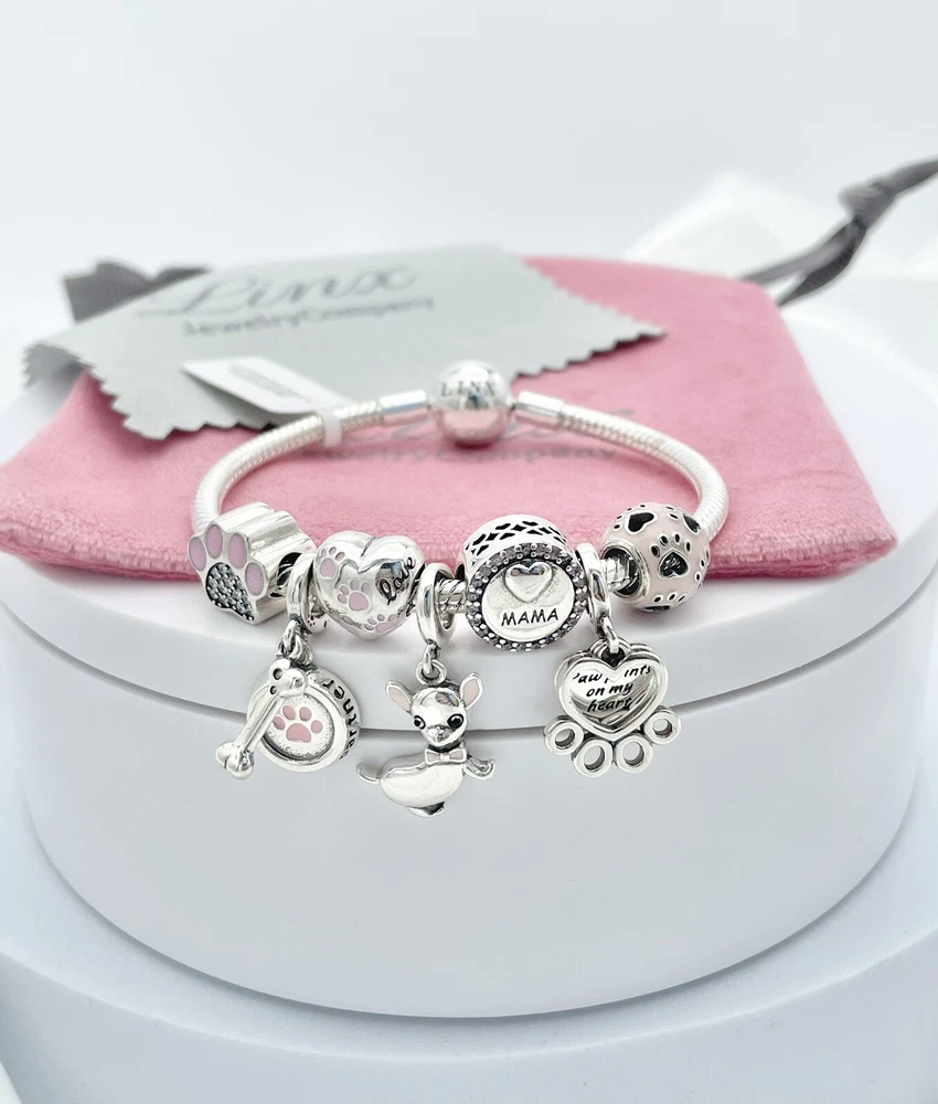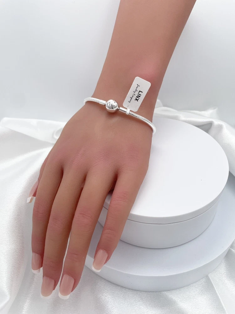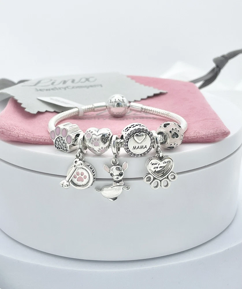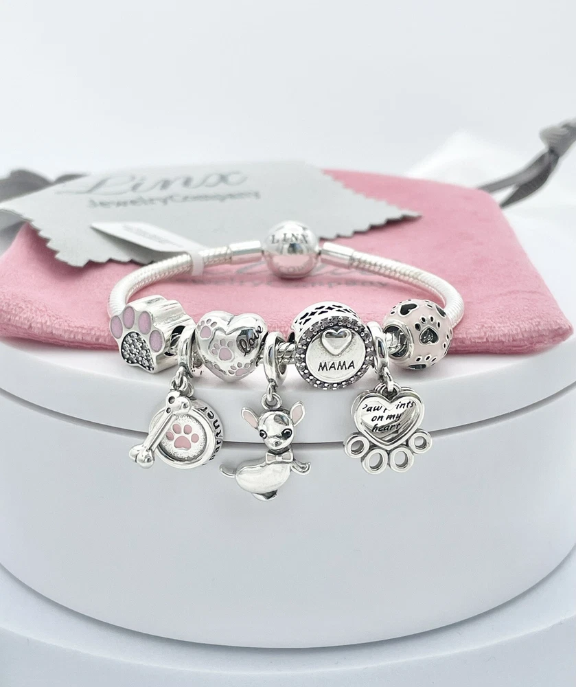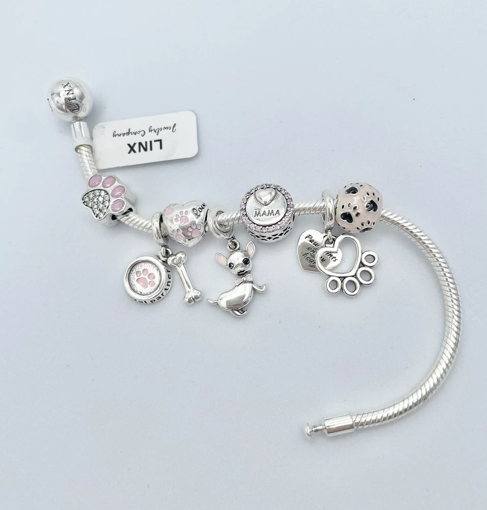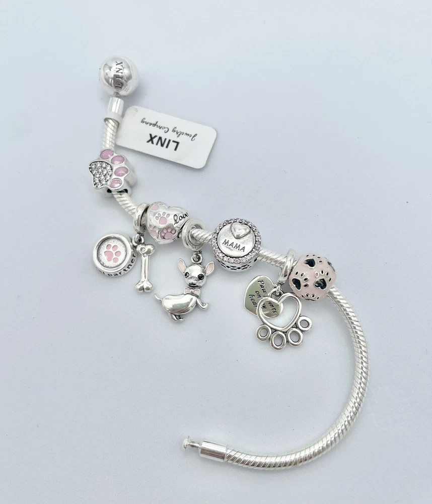Linx snake chain style charm bracelet in 925 sterling silver, with a ball clasp, featuring the signature Linx logo. This beautiful bracelet features 7 Linx charms also in 925 Sterling silver. Size 7.5 Bracelet is also available in sizes 6.3 (toddler size), 6.7, 7.1, 7.9, and 8.3. Should you require one of these sizes, please message us prior to purchasing and we will create a listing for you in your requested size. Please remember to add an additional inch to the measurement of your wrist in order to allow room for your charms, as the charms will cause the bracelet to fit a bit tighter. Bracelet is new with tags and will also come with the original Linx velvet jewelry pouch, and Linx sterling silver polishing cloth.