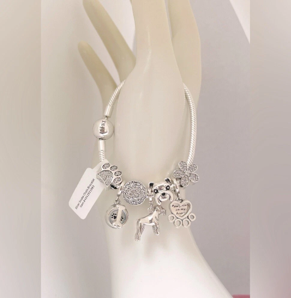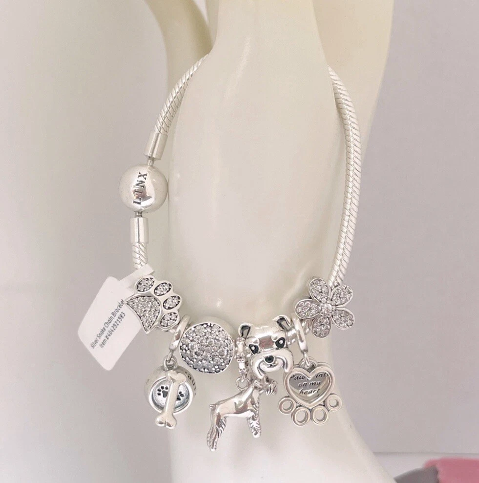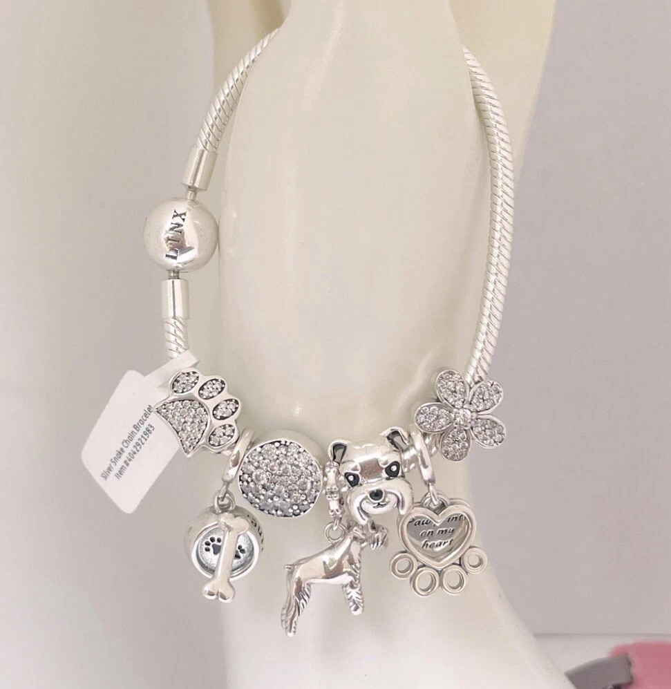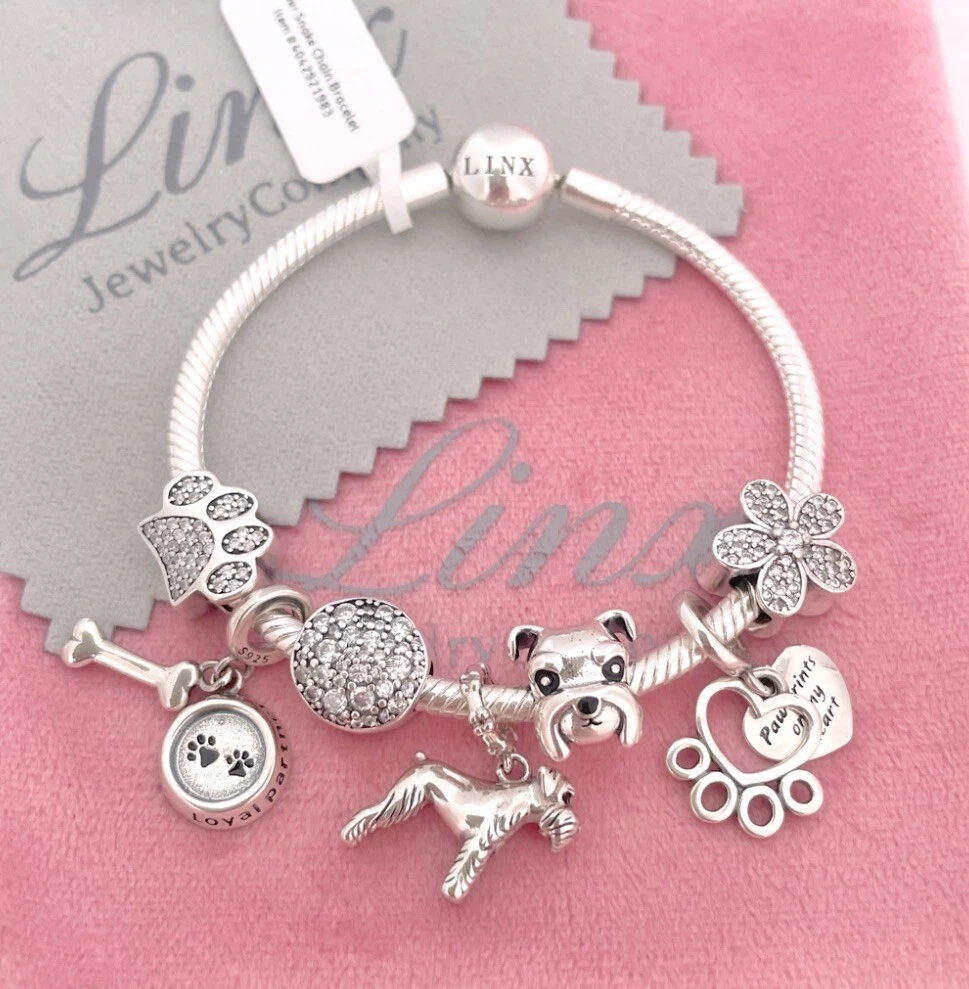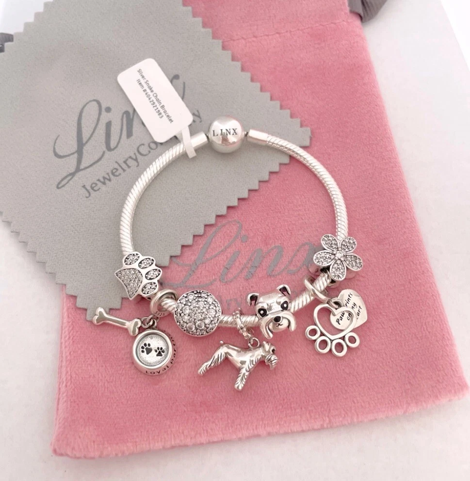 Linx snake chain style charm bracelet in 925 sterling silver, with a ball clasp, featuring the signature Linx logo. This beautiful bracelet features 7 Linx charms also in 925 Sterling silver. Size 7.5 Bracelet is also available in sizes 6.3 (toddler size), 6.7, 7.1, 7.9, and 8.3. Should you require one of these sizes, please message us prior to purchasing and we will create a listing for you in your requested size. Please remember to add an additional inch to the measurement of your wrist in order to allow room for your charms, as the charms will cause the bracelet to fit a bit tighter. Bracelet is new with tags and will also come with the original Linx velvet jewelry pouch, and Linx sterling silver polishing cloth.