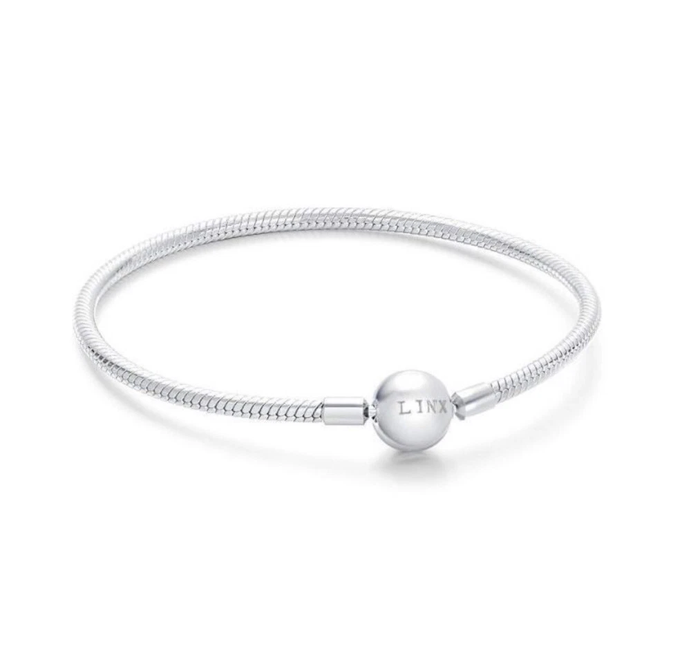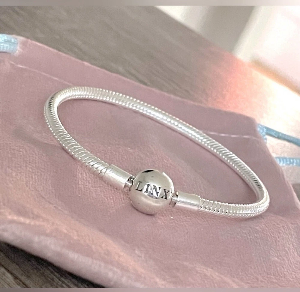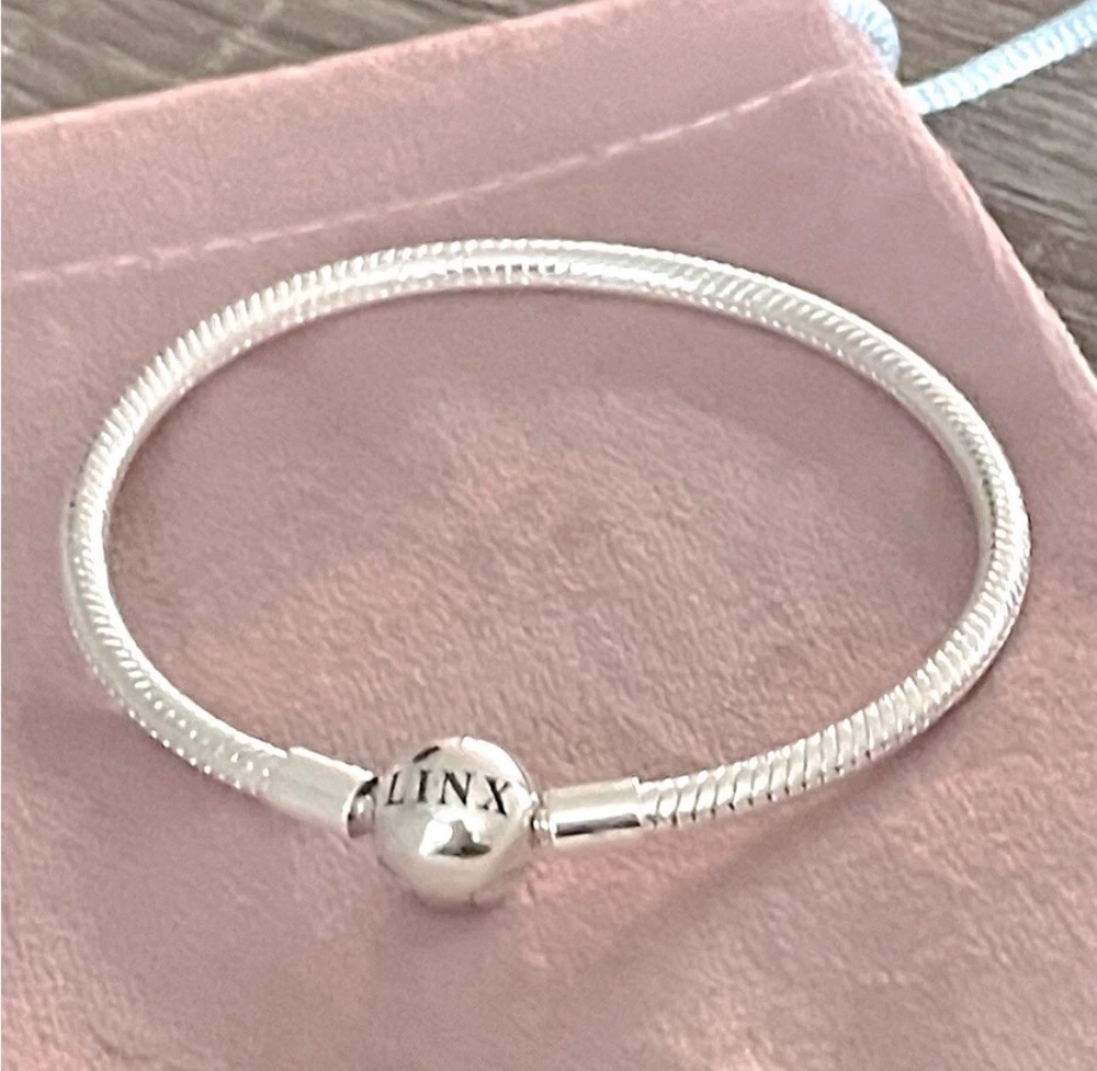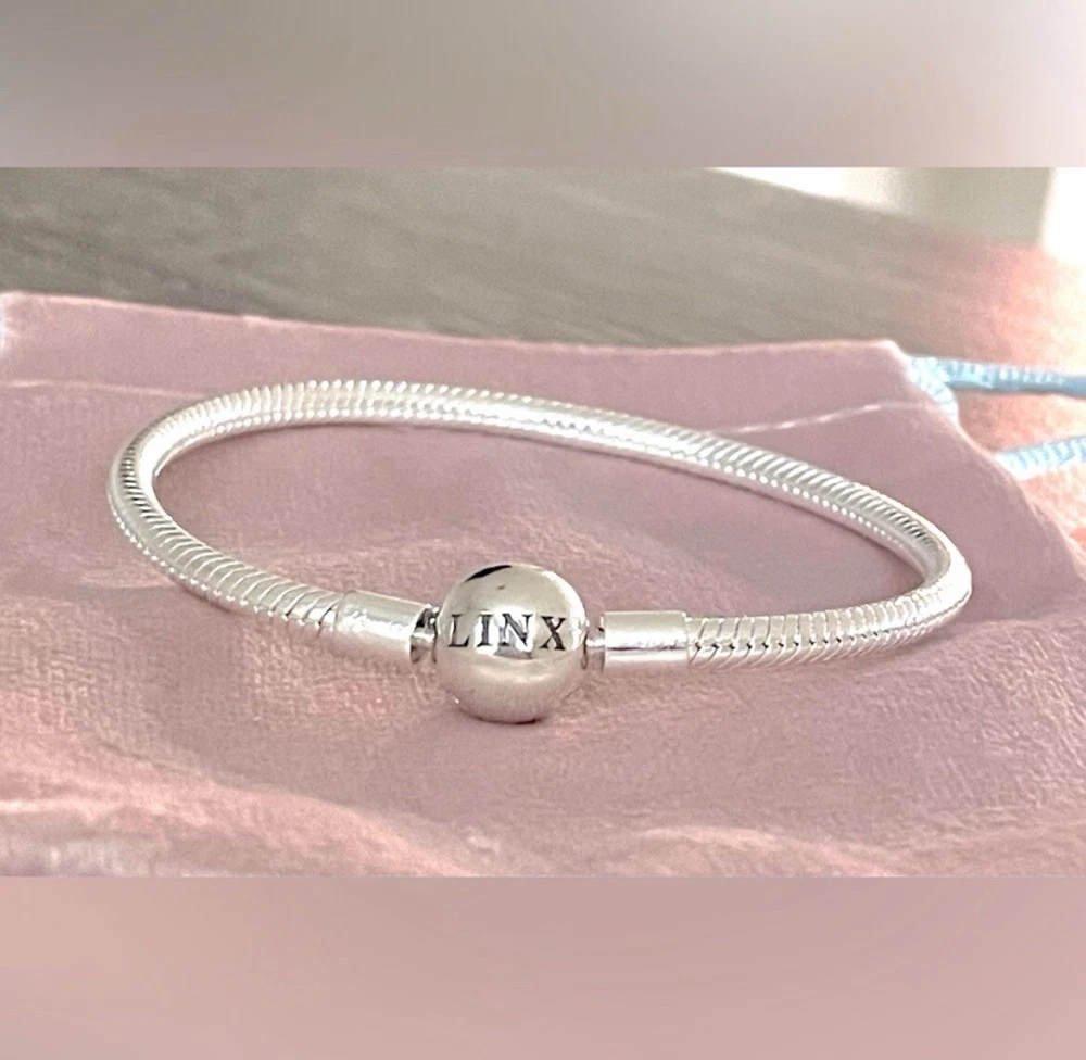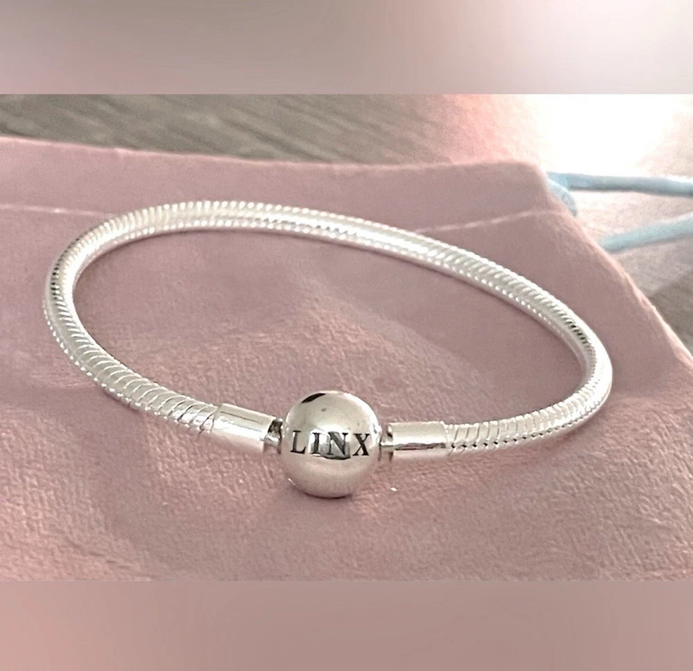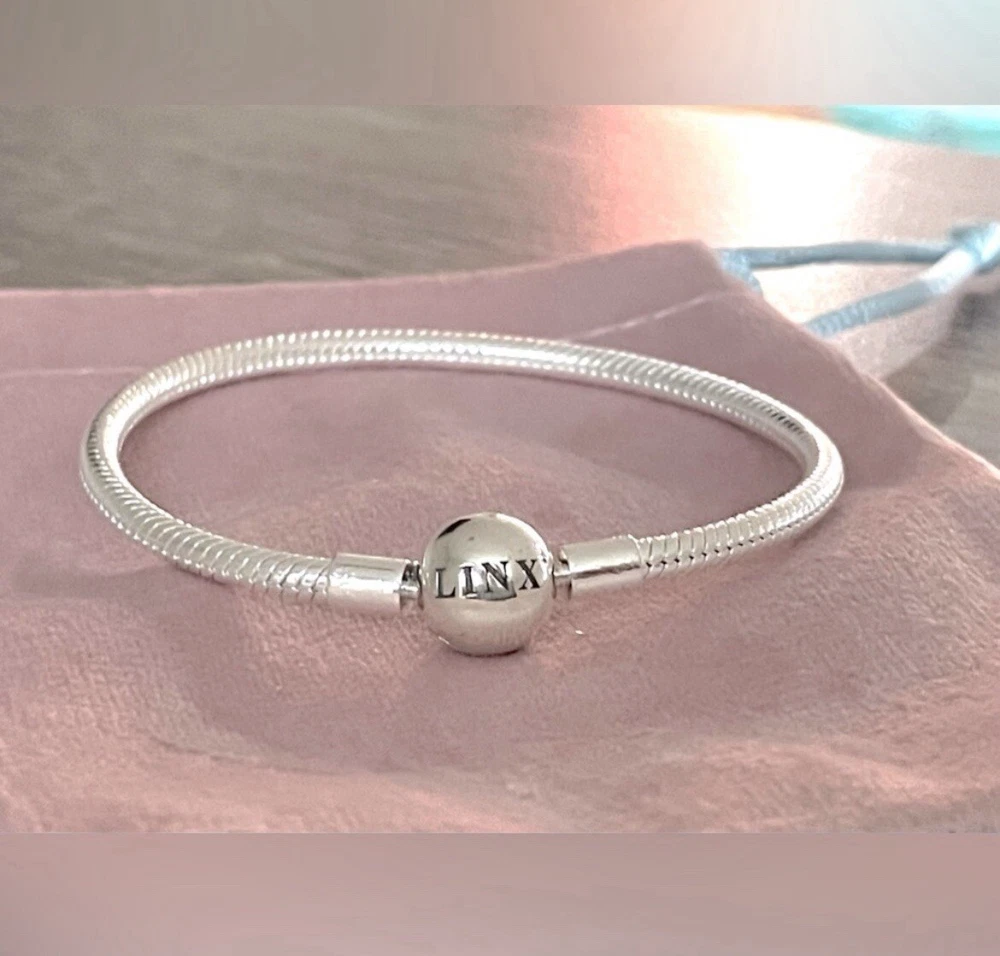 Linx snake chain style charm bracelet in 925 sterling silver, with a ball clasp featuring the signature Linx logo. Linx charm bracelets are compatible with not only Linx brand charms, but most standard size charms of other brands as well. This bracelet will new with tags, in the original Linx velvet jewelry pouch and will include a sterling silver polishing cloth. This bracelet is size 7.1, but is also available in sizes 6.3 (toddler size), 6.7, 7.5, 7.9, and 8.3 on other listings. *** PLEASE ADD 1 INCH TO THE MEASUREMENT OF YOUR WRIST AND ORDER TO ALLOW ROOM FOR THE CHARMS, AS THE CHARMS WILL CAUSE THE BRACELET TO FIT A BIT TIGHTER. Please message us with any questions about sizing prior to purchasing, we are happy to help. Selecting the appropriate sizes extremely important, as we are unable to offer sizing exchanges.