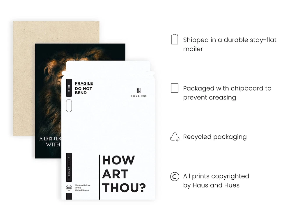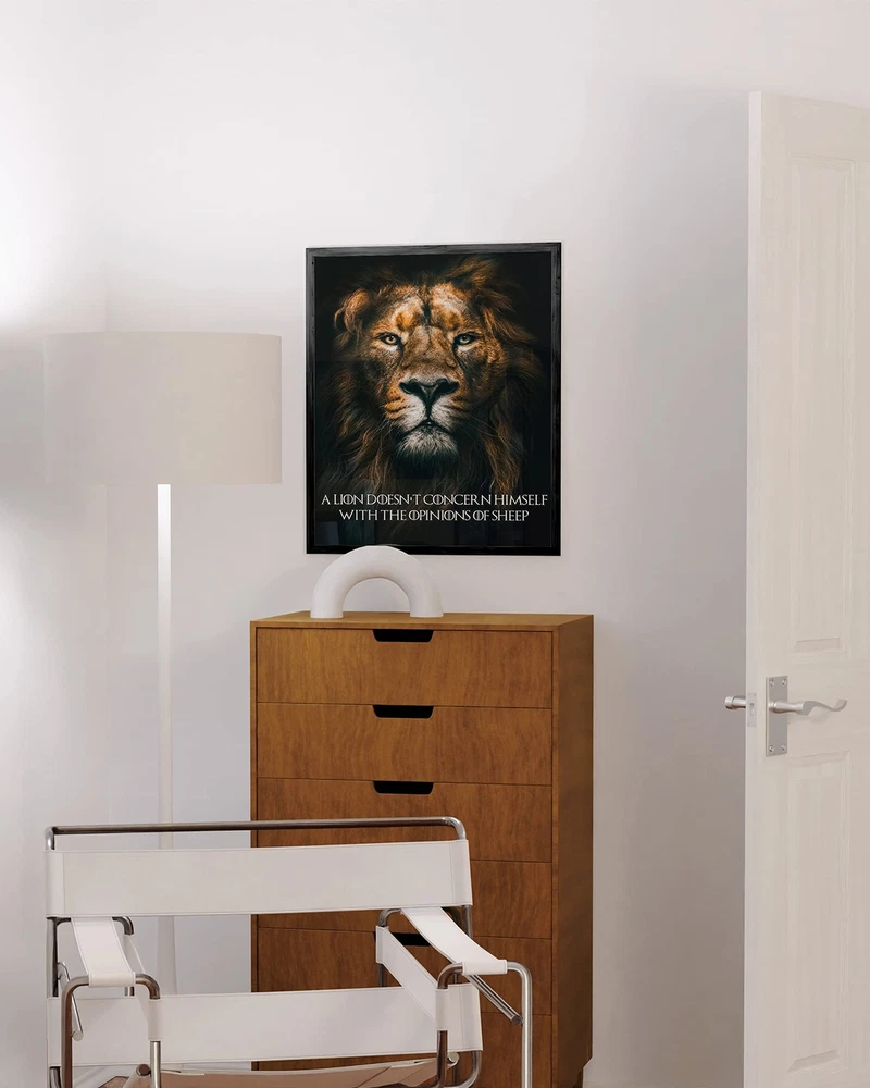 INSPIRATIONAL WALL ART FOR OFFICE: Create a massive statement in your living room or office with fierce lion art. This beautiful and realistic-looking picture of lion is going to be a breathtaking or powerful focal point in your beloved space. Anyone who looks at this inspirational lion wall art will be stunned at the majestic, battle-scarred lion and the ferocious energy it radiates. If you love a wow piece that will stop your guests in their tracks, then this wall art is for you! LION WALL ART FOR LIVING ROOM: Get many compliments when you hang these outstanding lion motivational posters by . It's a beautiful addition to your son's room, husband's man cave, music studio, game room, and even in your hallways. You're sure to catch yourself or your family staring and admiring this lion art. You may display it as is using adhesive tape or you can make it more sophisticated by framing it with beige or black oak frames EXCEPTIONAL QUALITY, MADE TO LAST: Haus & Hues supports the art community worldwide. We only use Giclée printing, which is superior to all other printing forms because it holds its colors far longer than any standard prints. Each art print is printed on acid-free and fade-resistant archival linen paper. Our inspirational quotes wall art is packaged with chipboard pads to protect against creases & dents, then shipped in Kraft self-seal stay-flat mailers to preserve your artwork in transit ORDER WITH CONFIDENCE, EXPECT HIGH QUALITY: Haus & Hues aesthetic wall pictures online w/ confidence. We take pride in the quality of our lion posters for wall. Our amazing in-house team handles your art prints with the utmost care, from designing to printing & shipping to meet & exceed your every expectation. If there’s any problem with your order, simply us, and we will you or offer you a . So, either you'll love your new inspirational lion wall art, or it's free IDEAL GIFT: This rivetting poster of the lion together with its inspiring quote makes a perfect gift to anyone who loves animals and motivation wall art. Share your passion for animals and anything positive when you give this lion wall decor to your family, friends, loved ones, and colleagues. lion poster is the perfect gift to give to spruce up an apartment in the city, a cabin by the woods, or your very own bedroom