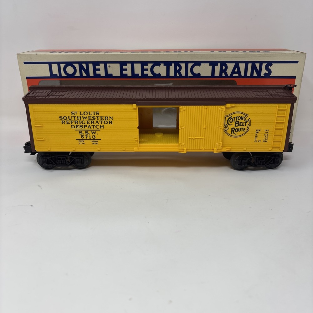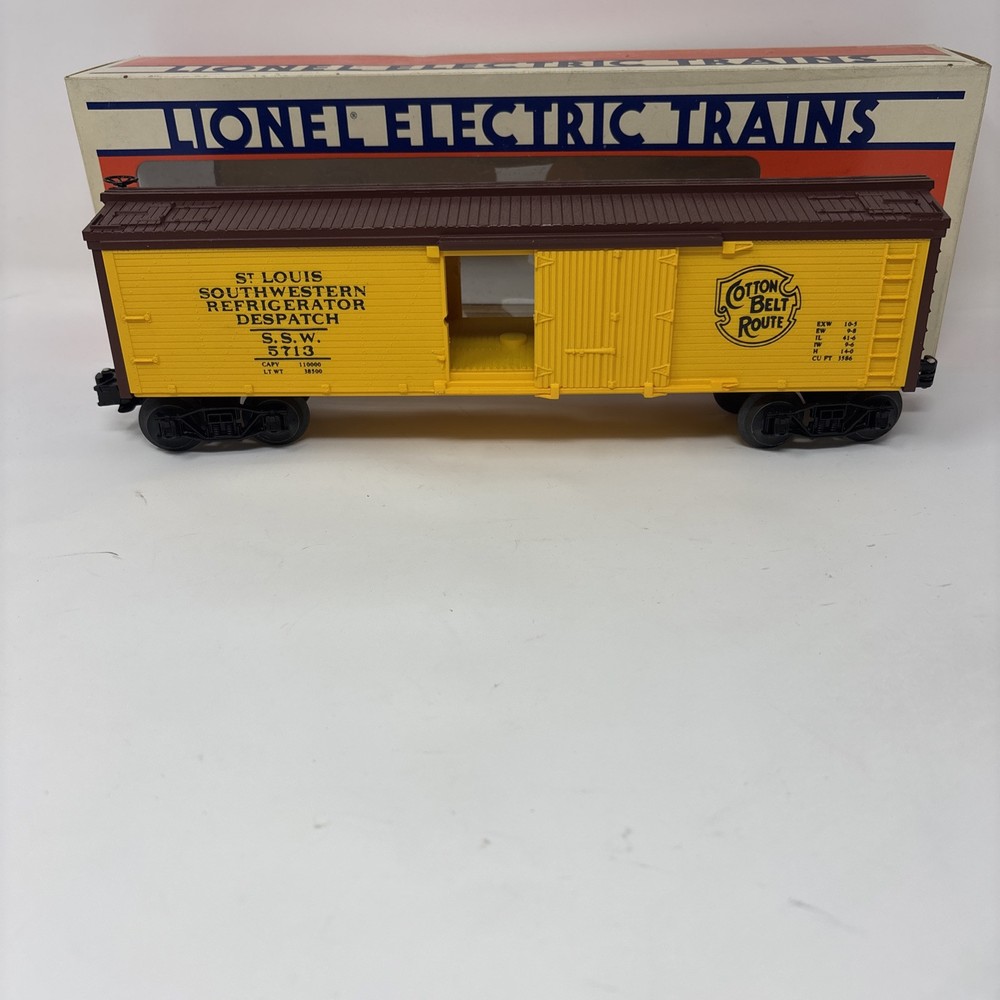 The product is a Lionel O Gauge Southwestern Cotton Belt Reefer Car replica of Santa Fe. It comes with its original box and is a part of the Lionel brand. It is a toy model railroad freight car.