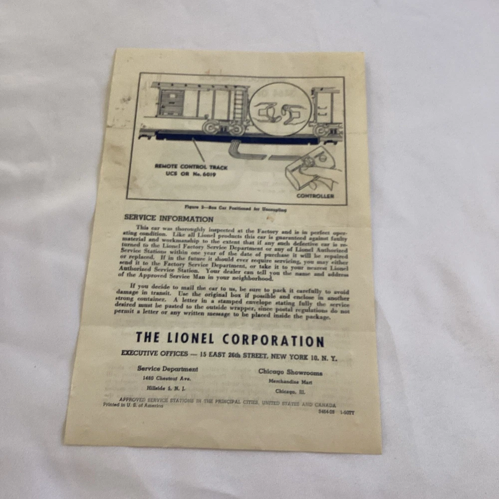 This auction is for Lionel number 3464 operating box car. It is brown and marked New York Central system. It has sliding doors with a man that comes out. It comes with its original instructions. It is used, but in nice condition. Please look at the pictures over carefully And email questions or for more pictures. The San Luis Obispo Railroad Museum, SLORRM, located in San Luis Obispo California is housed in the original 1894 Southern Pacific Railroad Freighthouse. We are currently raising money for new projects and appreciate your looking and bidding. If you are in the California Central Coast area, please stop by the museum or visit on-line.