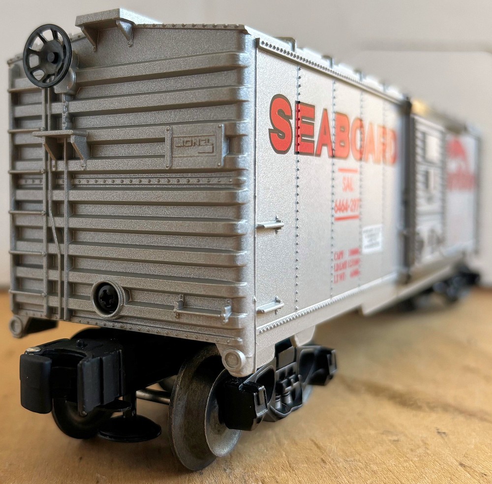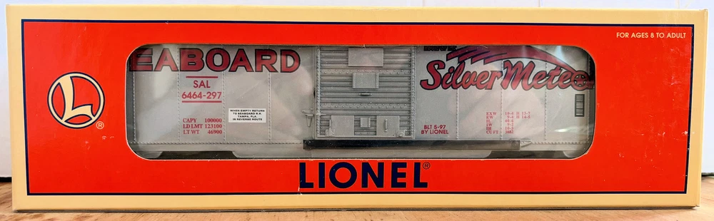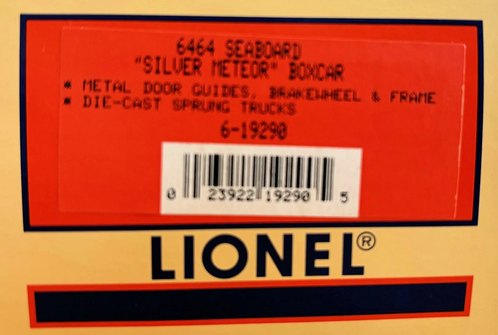 LIONEL 6-19290 O-GAUGE SEABOARD SILVER METEOR BOX CAR SAL 6464-297 RTR OVP METAL LIONEL 6-19290 O-GAUGE SEABOARD SILVER METEOR BOX CAR SAL 6464-297 RTR OVP METAL FRAME, DOOR GUIDES, WHEELS AND AXLES OPERATING KNUCKLE COUPLERS DIE-CAST SPRUNG TRUCKS ------------------------------- Additional Information from Internet Encyclopedia The Seaboard Air Line Railroad (reporting mark SAL), which styled itself as "The Route of Courteous Service", was an American railroad that existed from April 14, 1900, until July 1, 1967, when it merged with the Atlantic Coast Line Railroad, its longtime rival, to form the Seaboard Coast Line Railroad. Predecessor railroads dated from the 1830s and reorganized extensively to rebuild after the American Civil War. The company was headquartered in Norfolk, Virginia, until 1958, when its main offices were relocated to Richmond, Virginia. The Seaboard Air Line Railway Building in Norfolk's historic Freemason District still stands and has been converted into apartments. At the end of 1925 SAL operated 3,929 miles of road, not including its flock of subsidiaries; at the end of 1960 it reported 4,135 miles. The main line ran from Richmond via Raleigh, North Carolina, Columbia, South Carolina, and Savannah, Georgia to Jacksonville, Florida, a major interchange point for passenger trains bringing travelers to the Sunshine State. From Jacksonville, Seaboard rails continued to Tampa, St. Petersburg, West Palm Beach and Miami. Other important Seaboard routes included a line from Jacksonville via Tallahassee to a connection with the Louisville and Nashville Railroad (L&N) at Chattahoochee, Florida, for through service to New Orleans; a line to Atlanta, Georgia, and Birmingham, Alabama, connecting with the main line at Hamlet, North Carolina; and a line from the main at Norlina, North Carolina, to Portsmouth, Virginia, the earliest route of what became the Seaboard. In the first half of the 20th century, Seaboard, along with its main competitors Atlantic Coast Line Railroad, Florida East Coast Railway and Southern Railway, contributed greatly to the economic development of the Southeastern United States, and particularly to that of Florida. Its trains brought vacationers to Florida from the Northeast and carried southern timber, minerals and produce, especially Florida citrus crops, to the northern states. FREE scheduling, supersized images and templates. Get Vendio Sales Manager. Make your listings stand out with FREE Vendio custom templates! FREE scheduling, supersized images and templates. Get Vendio Sales Manager. Over 100,000,000 served. Get FREE counters from Vendio today!