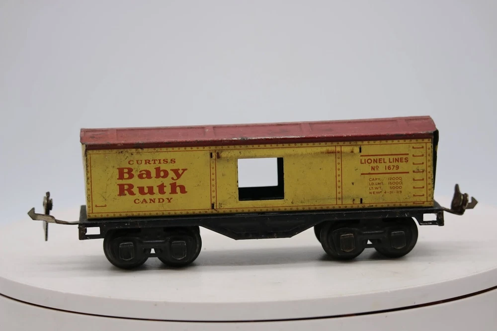 Lionel Vintage Prewar No.1679 Baby Ruth Box Car SKU#002876 Look closely at the pictures to see further details. We ships USPS PLEASE see photos for detailed condition!! There may be pieces that are missing or broken including, but not limited to, couplers, brake wheels, steps, ladders, railings, etc. May need detailed cleaning. PLEASE LOOK AT THE PHOTOS CAREFULLY BEFORE PURCHASING!! If you are purchasing more than one item from us and would like combined shipping, PLEASE request an adjusted invoice from us while still in the cart and BEFORE paying. Ebay does not usually calculate combined shipping accurately and you might get overcharged. Please be aware that when we photograph items, we use lighting that will show the details well. Although we try to present the product as accurately as possible, the lighting may affect the overall look of the item by appearing lighter/darker or possibly a different hue than the actual item. Depending on the type of lighting you have in your home, there may be some differences between the photos and the actual item. If this is a concern of yours, please feel free to request additional photos made in natural lighting or ask for a more detailed description of the item PRIOR TO PURCHASE! PLEASE NOTE: We greatly appreciate your interest in our item for sale. We look forward to a pleasant, quick and satisfying transaction for everybody, so please note the following information before bidding. Thank you! ITEM DESCRIPTIONS: * We will try to describe items well and provide plenty of photos. Please review these carefully before bidding or purchasing. * Only the items pictured and described are what you will receive when purchased. * We will occasionally offer an item clearly marked "AS-IS". This means that we are not sure if it works because we are unable to test it for whatever reason. We will offer these at a discounted price then a similar "working" item. It is possible that these items will work fine, but it also is possible that these items are more useful for their parts. Please only bid on or purchase these items if you are well aware of this, as we will only provide refunds of actual item price (no shipping cost refunds) for these items. * If you have any questions that aren't addressed by the descriptions or photos, please feel free to ask before you bid. SHIPPING: * We offer international shipping, if you have any questions please reach out. * We try to pack items as carefully as possible, but damage may occur during shipping. If you receive an item that was damaged in shipping, please contact us and we will work with you to resolve the problem. * We will combine shipping costs for all items the same buyer purchases from us within 2 days. Please wait to pay for items until you're done shopping with us. Please contact us if you're expecting to buy more items from us, or to have us adjust the shipping costs. * We will usually ship items out within 24 hours of payment being received Sunday through Friday at noon. We will notify the buyer if there will be a delay in shipping for some reason. Please allow additional time for holidays and weekends when the post office is closed. If payment is received after noon (EST) on Friday, the item might not be shipped until the following Monday. * We do try to recycle shipping materials as much as possible. RETURNS: We abide by eBay's Money Back Guarantee. We definitely want our customers to be happy with their purchase! You may return an item within 30 days of receiving it with the following guidelines: * If the item is defective or damaged (unless we clearly marked the listing "AS-IS"), the buyer will receive a full refund after the buyer returns it and it is received by us. Customers who falsely claim their item is defective, damaged, or not as described in order to receive a full refund and free return shipping will be permanently blocked from making future purchases from us. * If the item is as described (including "AS-IS" items) and the buyer decides for any other reason than defective/damaged to return it, only the actual price of the item will be refunded once it has been returned and it is received by us. The buyer will be asked to pay all original and return shipping charges. This includes all reasons other than defective/damaged, including wrong size, wrong type, changed mind, etc. All "AS-IS" items will fall into this category of return. Please make sure the item is what you want before purchasing it. * Please contact us before initiating a refund request. FEEDBACK: We always leave feedback at the end of transaction. We consider the transaction to be over when we receive feedback from the buyer confirming the item arrived satisfactorily. If you are unsatisfied with your purchase please contact us before leaving neutral or negative feedback. WE APPRECIATE POSITIVE FEEDBACK IF YOU ARE SATISFIED WITH YOUR PURCHASE! THANK YOU FOR YOUR INTEREST IN THIS ITEM!