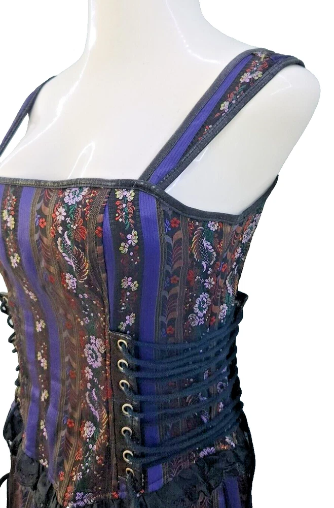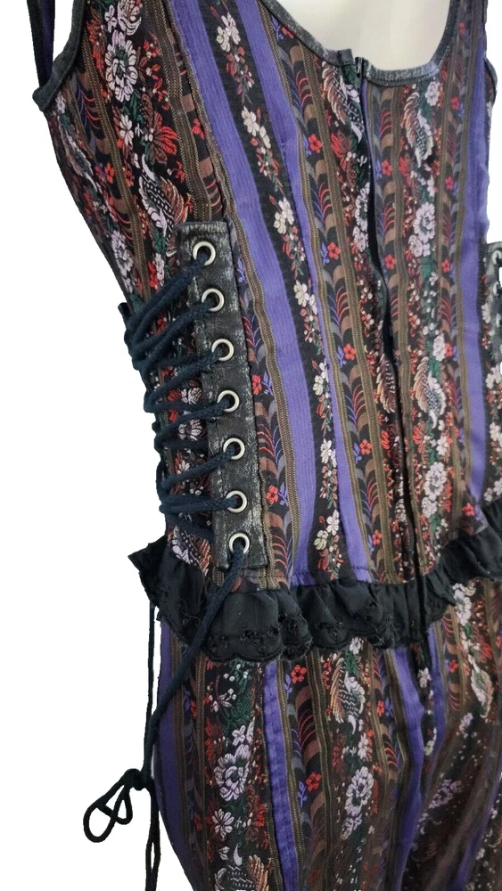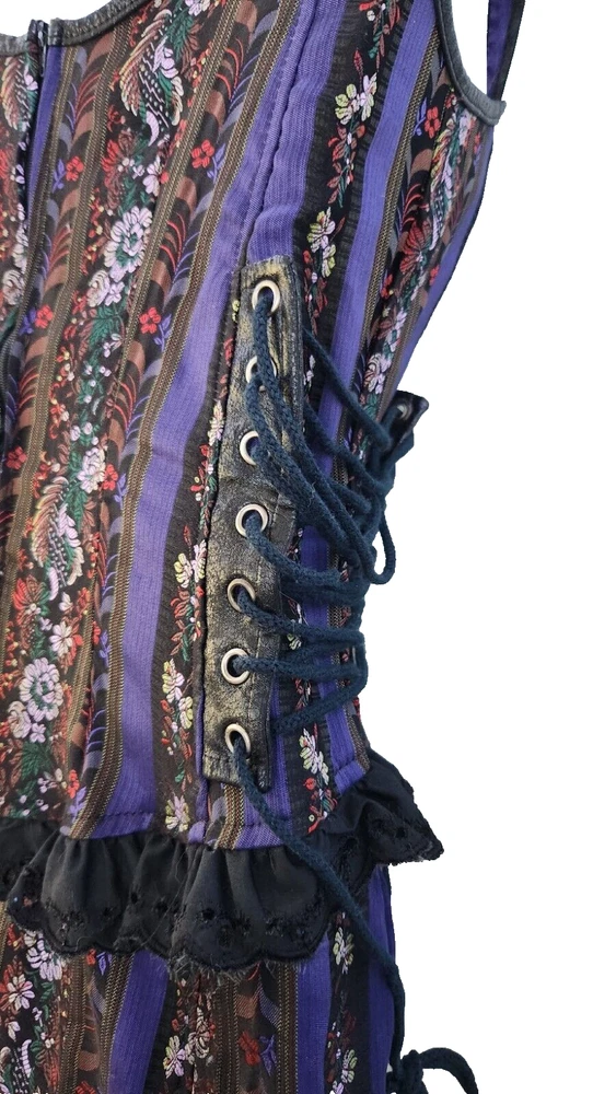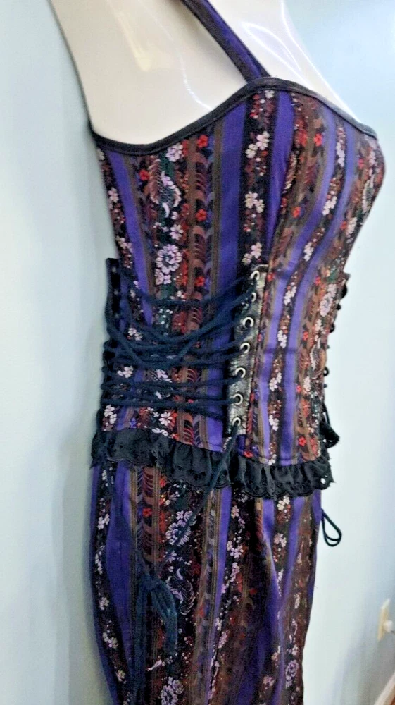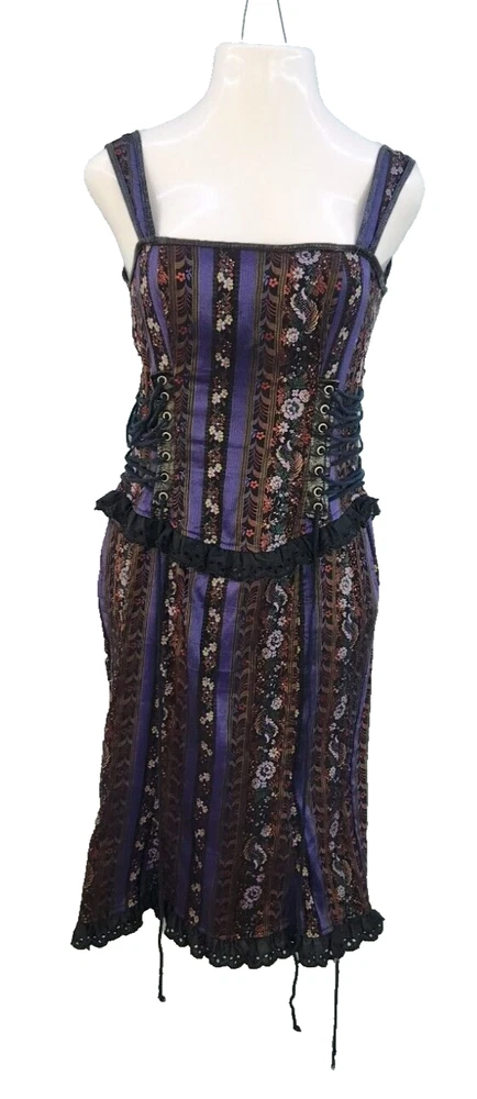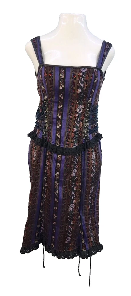 Lip Service Purple Floral Corset lace up Y2K Goth Dangerous Liaisons Dress Lip Service Los Angeles 2002 Fetish Classics Pencil Corset Dress Style 86 - 24 - HT Cut - 14305 "Large" size Measurements taken by seller: Measurements are taken with the dress laying flat Measurements in Inches Chest- 34" Waist- 28" (can be adjusted to smaller) Hips (at lace) - 34" Hips (widest part) - 36" Length (From top of zipper to base of skirt) - 34" Length (From top of shoulder strap to base of skirt) - 39" Condition information: Item is pre-owned and shows some signs of wear. Most notably some minor piling in places and some minor fraying along the edge of the lace details. The leather/pleather parts around the corset holes is notably crinkled and can be seen in photos. There are no notable tears or major damage on this dress. The zipper zips up and down very smoothly/without any kind of snags. Dress has been gently cleaned and comes from a non-smoking household Please feel free to ask any questions about this dress, I am willing to provide more pictures of this item upon request. Will be sent USPS PRIORITY MAIL. **Signature upon delivery can be requested upon purchase.** I am willing to ship this dress via other shipping options if buyer wants, but if not specified I will be shipping this USPS Priority mail. Will be packed in a plastic clothing bag and shipped in a box to ensure safe delivery! Dress will be gently folded. And the tassels or strings for the corset sides will be loosely tied like seen in photos to help prevent them from being tangled.
