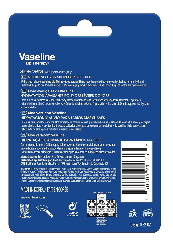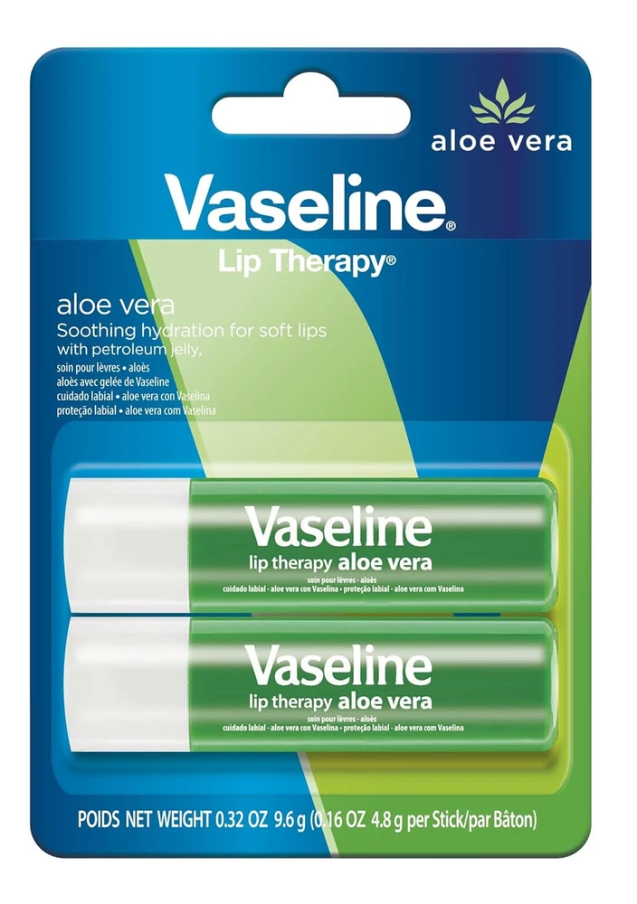 Store New Arrivals Add to Favorite View Feedback Contact Lip Therapy Aloe Care Twin Pack Description Finish Type Matte Product Dimensions 0.85 x 3.5 x 5.1 inches; 0.35 ounces Country of Origin Korea, Republic of Product Benefits Softening, Soothing, Repairing, Moisturizing Skin Type All Item Form Balm Soothes and Hydrates: Vaseline Lip Therapy with a touch of Aloe Vera soothes, leaving your lips feeling soft and hydrated while providing the essential moisturization your lips need. Convenient Stick Format: This handy pocket-sized lip balm has a non-sticky and non-greasy formula which spreads easily to deliver moisture to damaged lips. On-the Go Moisturization: Whether in your pocket, desk, or car, you can always be prepared to help protect and soothe your lips. Give your lips the essential moisturization they need with Vaseline Lip Therapy sticks. With the soothing power of petroleum jelly, Vaseline Lip Therapy sticks soothes and softens your lips while providing essential hydration for long lasting smoothness. Available in four variants: Aloe Vera, Original, Rosy and Cocoa Butter. Use Vaseline Lip Therapy sticks daily for long-lasting moisturization and beautiful lips. Kiss those cracked, chapped, dry lips goodbye with The Soothing Power You Trust, Now In A Stick! ABOUT US We offer the best prices around on high quality products. Our E-store includes media such as books, movies, music and games while offering electronics, toys, sporting apparel, clothing, tools, general home, garden items and more. SHIPPING We are always working hard to ensure your package arrives as soon as possible. Please understand that some factors like weather, high postal traffic, and the performance of shipping companies are outside of our control. We offer free shipping to the lower 48 states and ship within 2 business days of payment, usually sooner. We do not accept P.O. Boxes. Please provide a physical address. RETURNS We offer a 30-Day Return Policy on items which you are not completely satisfied with. You have the option for a full-refund or an exchange of the item. No returns are available on items shipped outside of the USA. PAYMENT We accept PayPal. CONTACT US This page content is yet to come Please ad us to your favorite seller and visit again later Thank You CUSTOMER SATISFACTION We try our very best to make sure every customer is completely satisfied. If there's a problem, message us! We're happy to help.