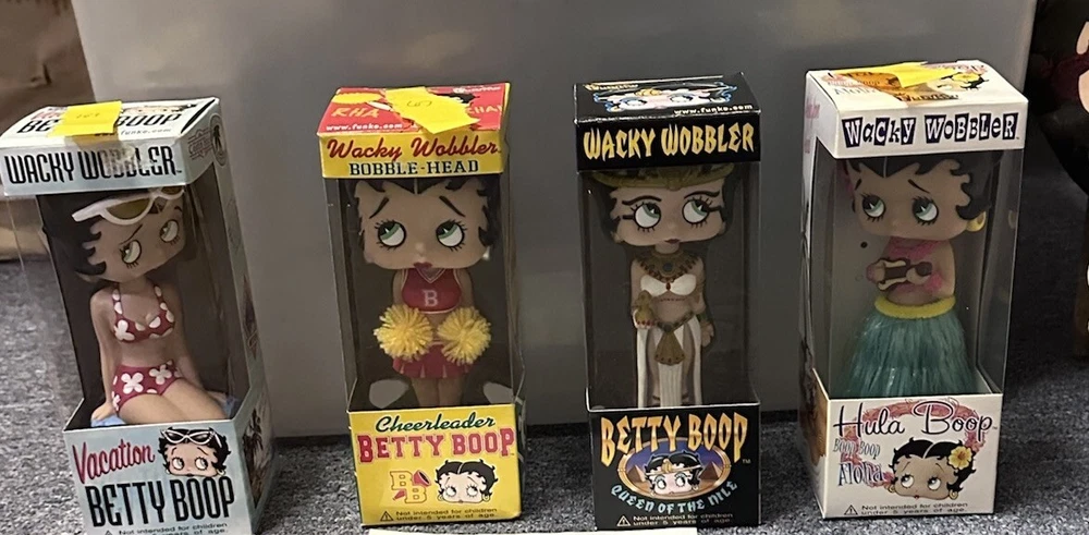Listing Title: Betty Boop Wacky Wobbler Bobblehead Bundle – Set of 4 by Funko Description: This is a rare collection of four Betty Boop Wacky Wobbler bobbleheads by Funko. Each bobblehead showcases Betty Boop in a different fun and playful theme, perfect for collectors or fans of this iconic character. While three of the bobbleheads are in mint condition and remain unopened in their original boxes, the third one from the left (second one from the right) shows some wear on the box and has been opened, but none of the items have been used. Details: • Brand/Manufacturer: Funko • Product Line: Wacky Wobbler Bobbleheads • Condition: • Three Bobbleheads: Mint in original boxes, unopened. • One Bobblehead: Box shows wear and has been opened, but item remains unused. • Included Themes: 1. Vacation Betty Boop: Dressed in a swimsuit with sunglasses for a sunny getaway. 2. Cheerleader Betty Boop: Spirited with pom-poms and a bright cheerleading outfit. 3. Queen of the Nile Betty Boop: Stunning Egyptian-inspired look with regal details (box shows wear and has been opened). 4. Hula Boop Betty Boop: Tropical-themed with a grass skirt and lei, channeling Hawaiian vibes. • Year of Production: As indicated on the packaging. • Collector’s Note: A complete set of themed bobbleheads, perfect for Betty Boop fans or Funko enthusiasts.