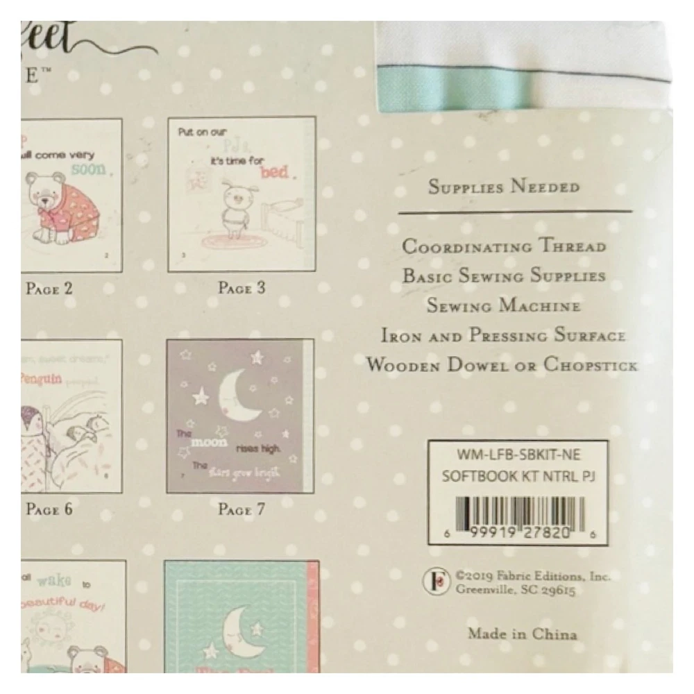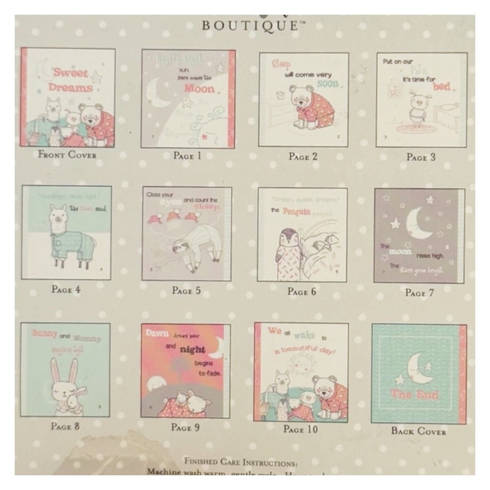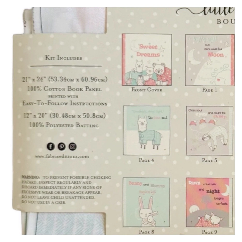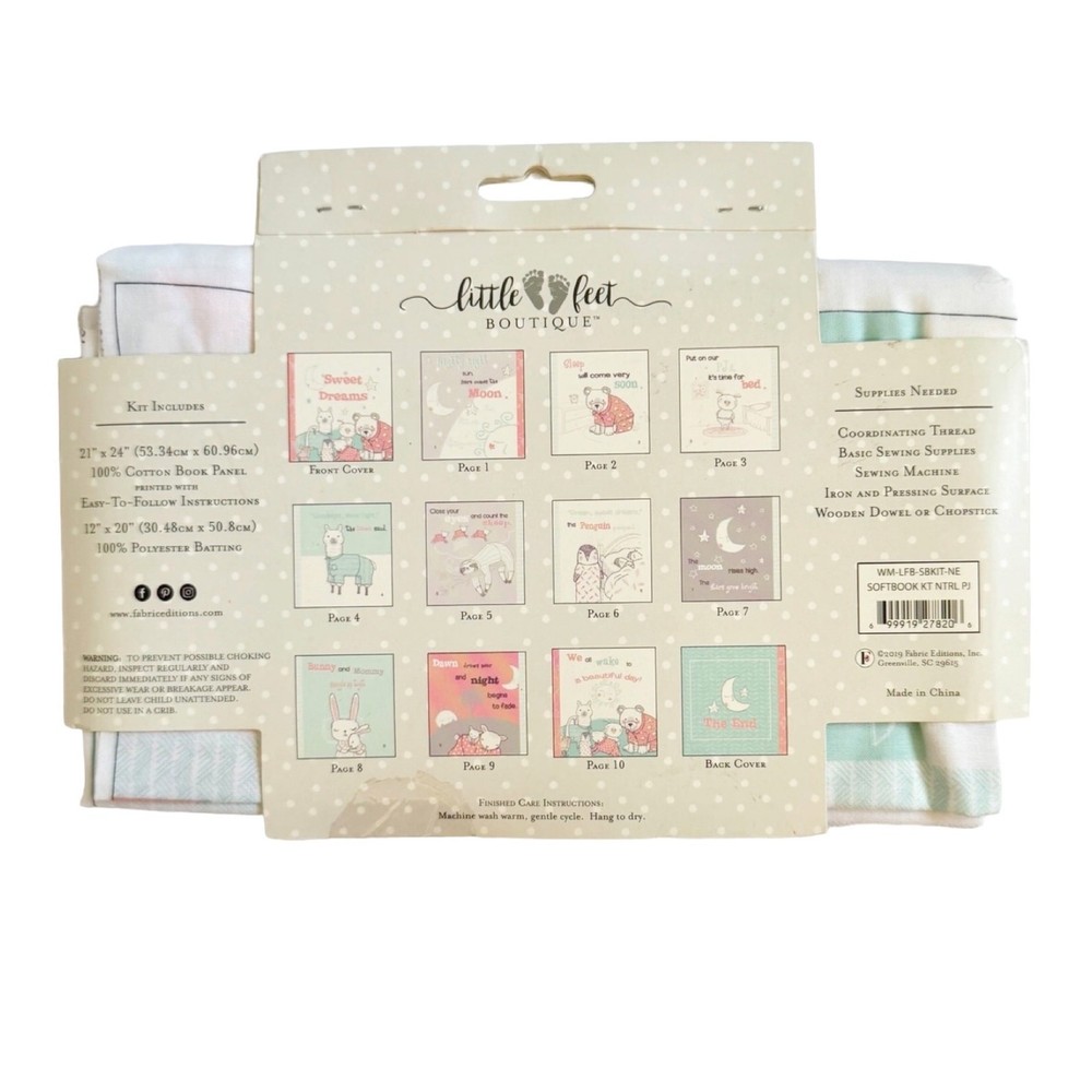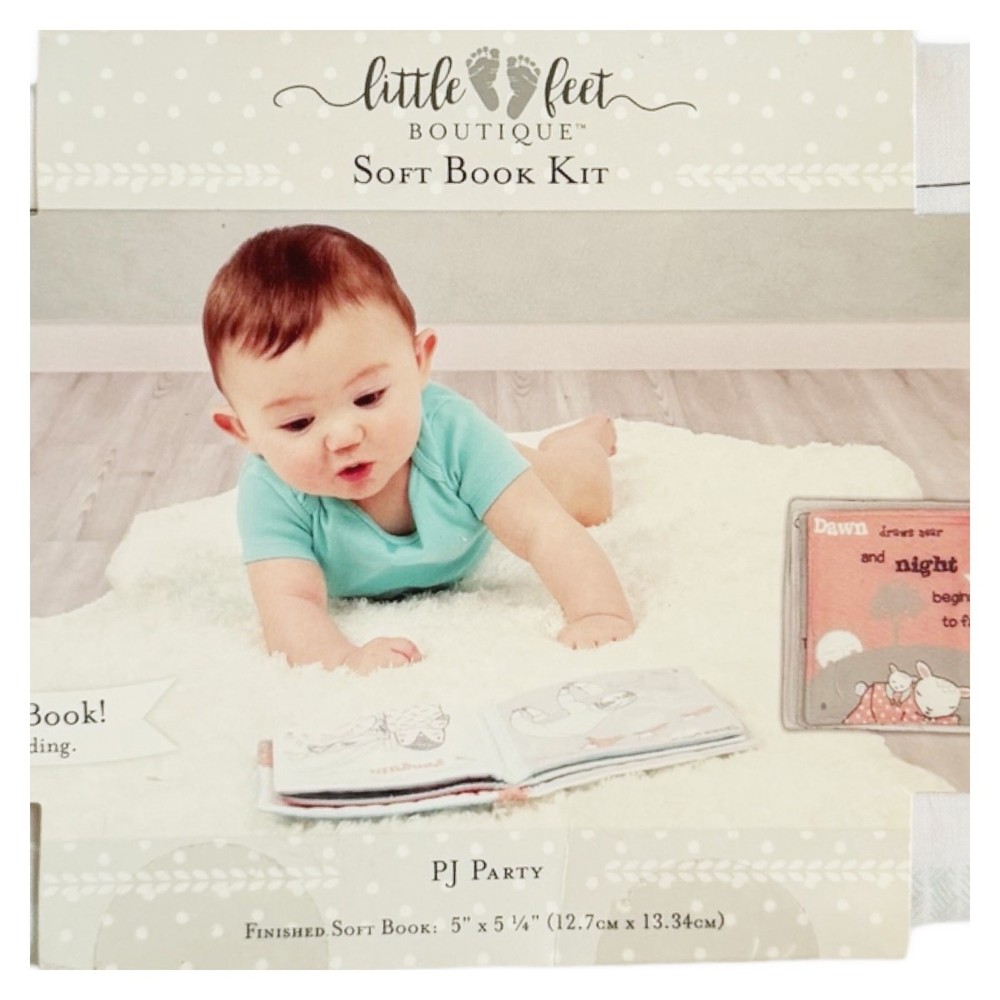 Little Feet Boutique “PJ Party” Soft Story Book Kit For Baby 5”x5.25” when Finished Sewing New in original packaging Make a soft book full of animal pictures and stories Sweet Dreams Kit includes: 21”x24” 100% Cotton book panel printed with 12x20” 100% Polyester batting (Additional supplies will be needed as listed on package) See photo for inside finished 12 page (including cover and back) book Shipped within one business day