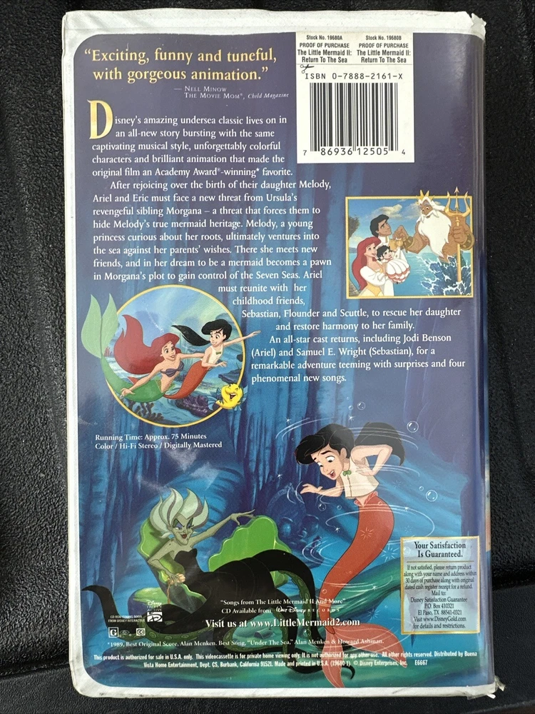 Country/Region of Manufacture:United StatesRating:GLanguage:EnglishUPC:0786936125054Sub-Genre:Animation/Animegtin13:0786936125054Release Year:2000Studio:Walt Disney VideoFormer Rental:NoEdition:Full ScreenMovie/TV Title:Little Mermaid II-Return to the SeaGenre:Children's Video