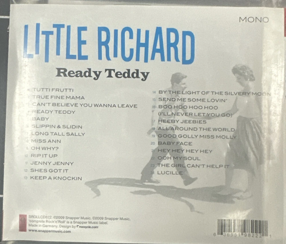 Little Richard ‘Ready Teddy’ CD came from my father’s private music collection. The CD is pretty much flawless, no scratching maybe a spot mark or two. The inlay has no handling damage. Overall it’s excellent condition and a fine buy at $5.