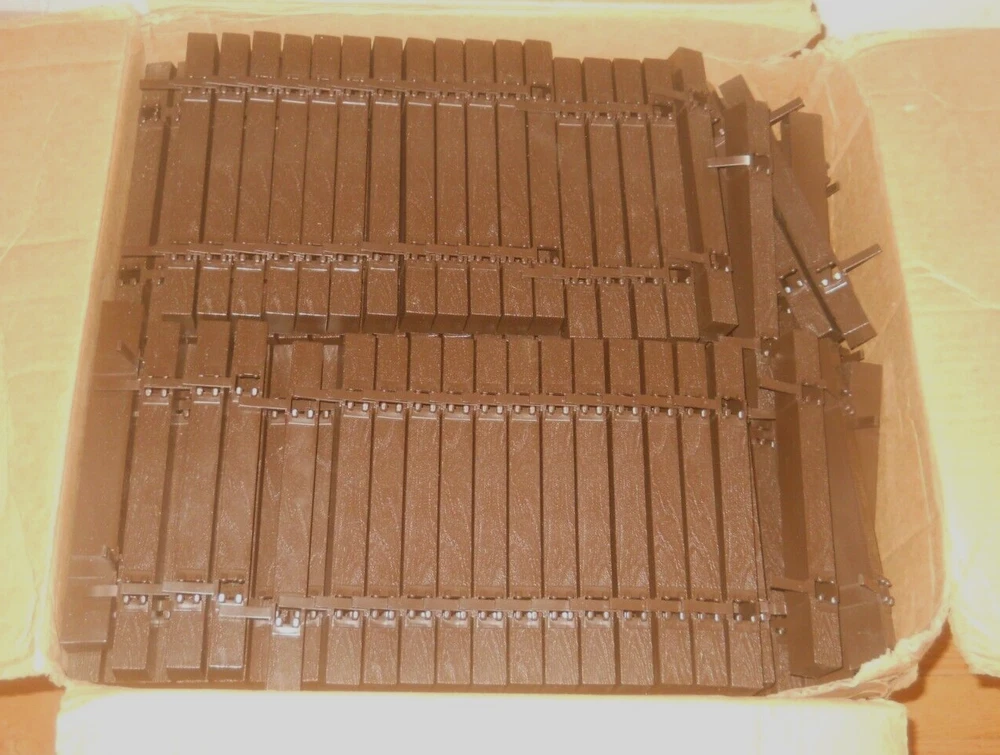 Live Steam 4.75" Gauge (1/12 Scale) Brown Plastic Sessums & Slagle Ties 8 1/2" x 3/4" x 1 Spacer tabs are 1 1/8" Tie bottom flange with is 7/16" We have over 750, but I would have to unload two boxes to count. If interested in more than 750, purchase the lot and I will invoice for the additional quantity at $1.00 per tie. We will combine. DO NOT USE EBAY computer generated invoice for paying. It will not be correct. This will probably have to ship in two boxes if you buy all of them. See condition comments and photos. NO RETURNS. If you have questions, please ask. Sold As Is.. See our other listings for one of the most varied estate collections being offered. We have acquired a major portion of the remaining NWSL inventory and will be selling it over the next few months Funds from the sales go to help the Colfax Railroad Museum.