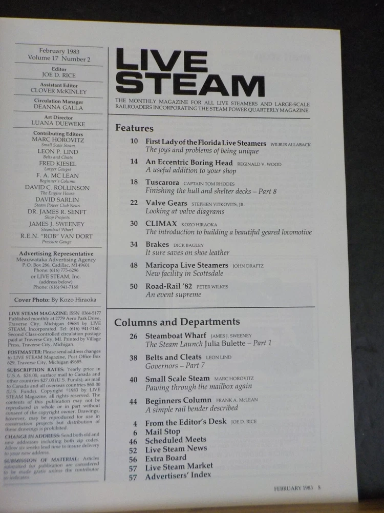 Live Steam Magazine 1983 February Building Kozo Hiraoka's 3/4 Scale Climax Features 10 First Lady of the Florida Live Steamers 14 An Eccentric Boring Head 18 Tuscarora 22 Valve Gears 30 CLIMAX 34 Brakes 48 Maricopa Live Steamers 50 Road-Rail '82 & Much More All pictures are of the actual item. There may be reflection from the lights in some photos. We try to take photos of any damage. If this is a railroad item, this material is obsolete and no longer in use by the railroad. Please email with questions. Publishers of Train Shed Cyclopedias and Stephans Railroad Directories. Large inventory of railroad books and magazines. Thank you for buying from us. Shipping charges US Shipments: When you add multiple items to your cart, the reduced shipping charges will automatically be calculated. For direct postage rates to other countries, send me an email. Shipping varies by weight. Terms and conditions All sales are final. Returns accepted if item is not as described. Contact us before making a return. No warranty is stated or implied. Thanks for looking at our items.