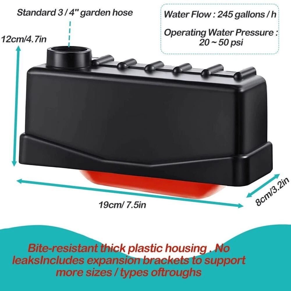 Product Description Features: *Automatic Tank Float Valve: The livestock trough float valve features automatic water level control, eliminating the need for manual inspection. Prevents overfilling and flooding of barns, swimming pools, ponds, and fountain basins. *Float Tank Valve: Suitable for water tanks, troughs, drinkers, and gravity feed systems, providing automatic water level control for livestock and poultry in ranches, farms, swimming pools, fountains, and reservoirs. Compatible with standard 3/4-inch NPT garden hose connection, with a rate of up to 245 gallons per hour. Works effectively under water pressure between 20 and 50 psi. Easy to assemble and connect to the hose. *Sturdy Float Tank Valve: Constructed with a combination of PE thick plastic orange float, ABS thickened shell, and iron galvanized metal bracket, resilience against external impacts. *Easy to install: Includes PTFE tape for easy assembly. Simply connect the 34-inch hose, hang the float valve and bracket on the water tank, and tighten the screws to secure the bracket and shell. Specifications: Part Name:Tank Float Valve Material:PE plastic, ABS plastic, Iron Size:17.8*7.5*7cm Color:black+red Package Content: 2* Tank Float Valve Note: 1. The real color of the item may be slightly different from the pictures shown on website caused by many factors such as brightness of your monitor and light brightness. 2. Please allow slight manual measurement deviation for the data. Payment Payment must be completed within 5 days. If you have any problems about payment, please contact us via ebay message. Delivery details We only ship to confirmed ebay Order addresses. Please comfirm that your Order address is in line with your shipping address. Please kindly note that the c ombined shipping is not provided because the shipping fee is calculated by weight. Also, the each additional item means exactly the the same color and size. It takes about 7 -15 working days to US; about 10-30 working days to other countries. Transit time may be a little delayed because of the bad weather and customs inspection . If you do not receive your item within 30 working days since payment finished, please contact us immediately for further assistance. Contact us We strive for 100% customer satisfaction! Positive Feedback is very important to us. If you have any questions, p lease feel free to contact us via "Ask seller a question" . We will reply your email within 24 working hours. On Dec 5, 2024 at 02:48:51 PST, seller added the following information: