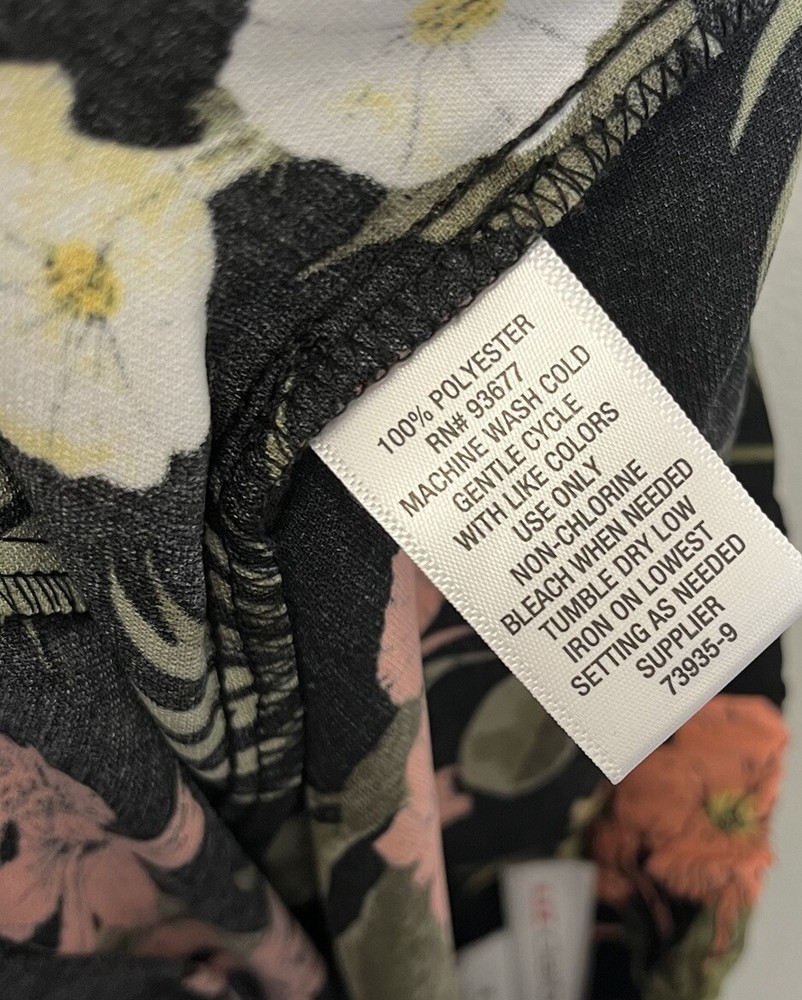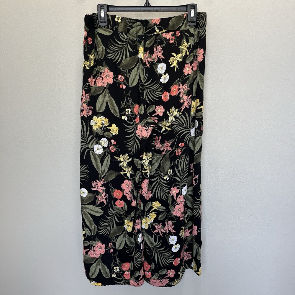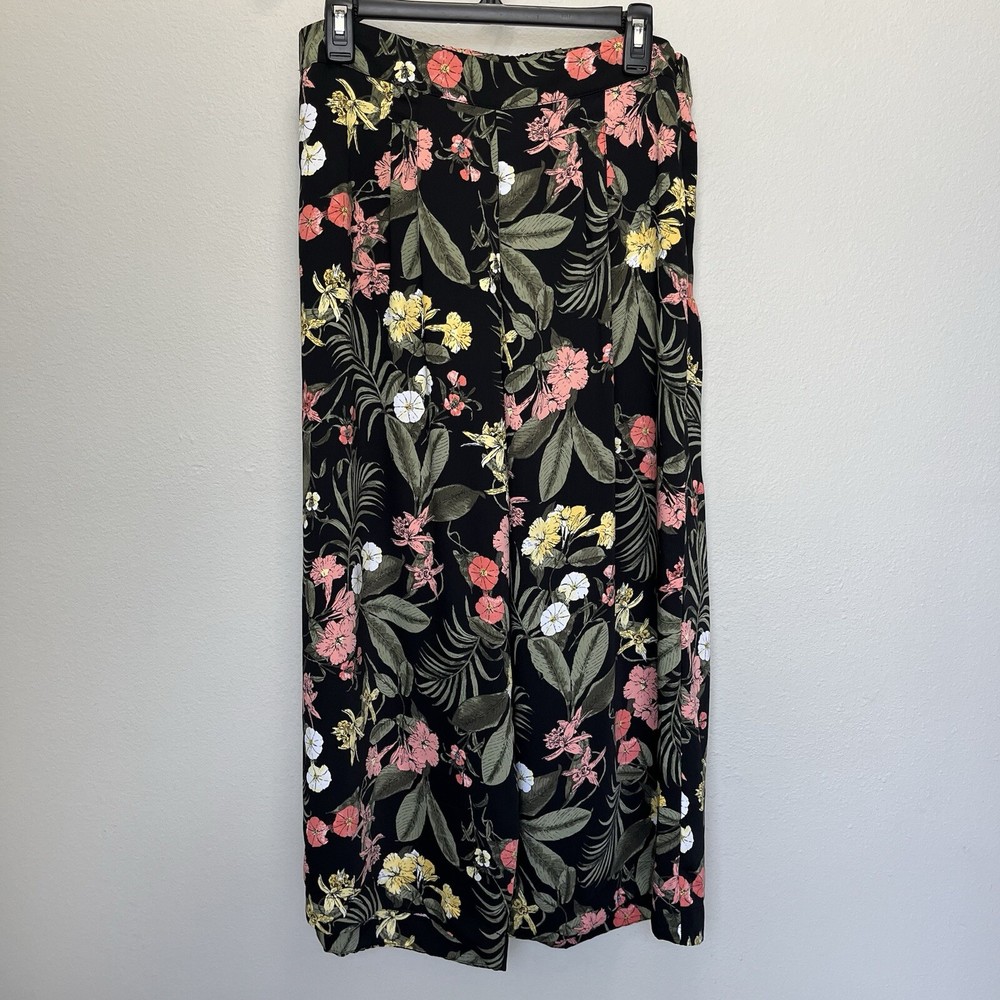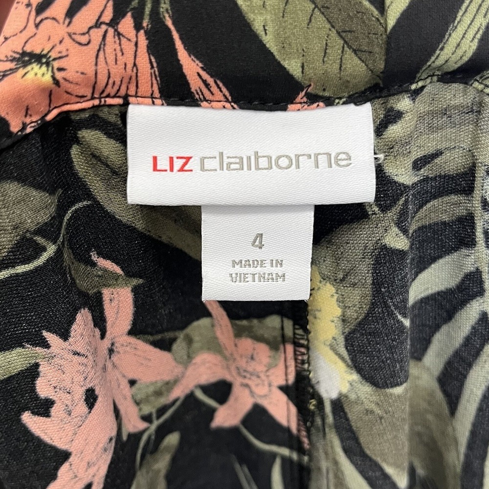 These Liz Claiborne pants are a stylish choice for travel or casual wear. The wide-leg design in a modern Hawaiian black floral print adds a trendy touch to the comfortable 100% polyester fabric. Featuring a high-rise waist and a zip closure, these size 4 pants have a flat front and a 25-inch inseam, making them a fashionable choice for any modern wardrobe. In excellent condition and look almost new Measures approximately 16” across waist laying flat with a 25” inseam and an 11” rise A6