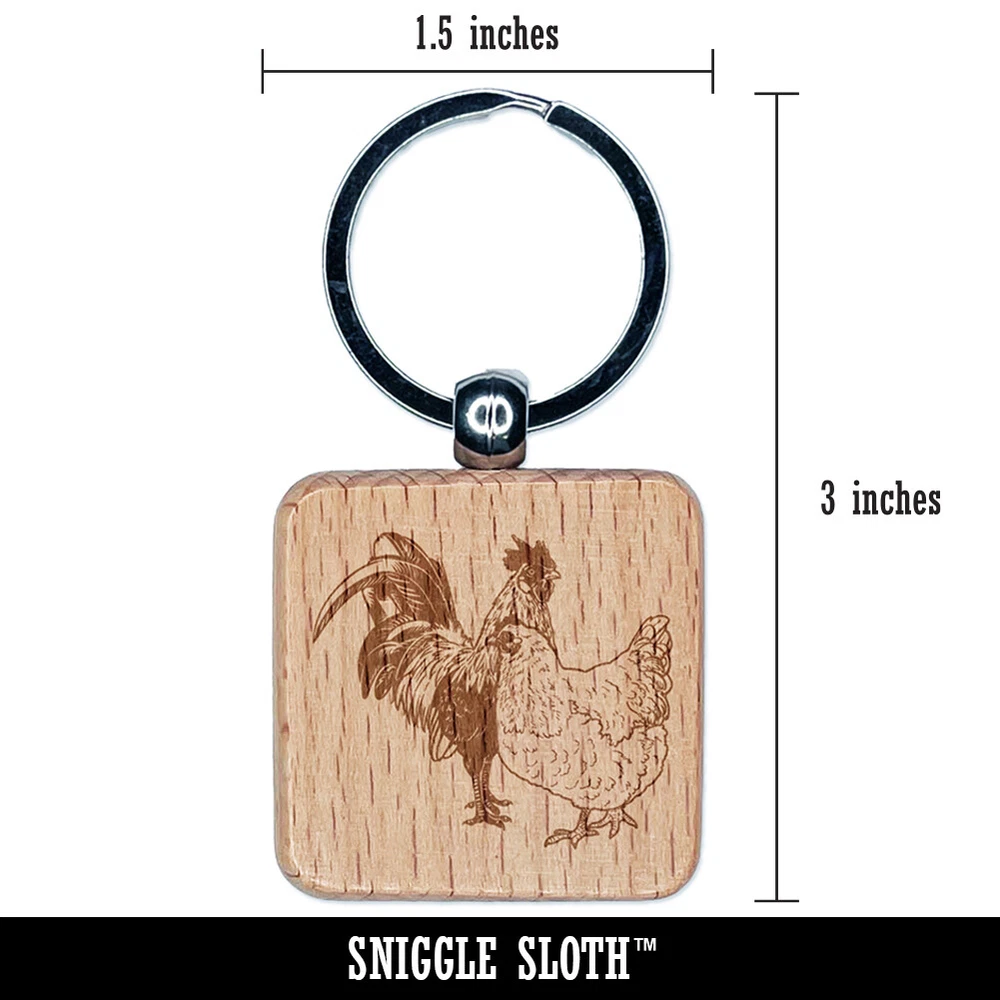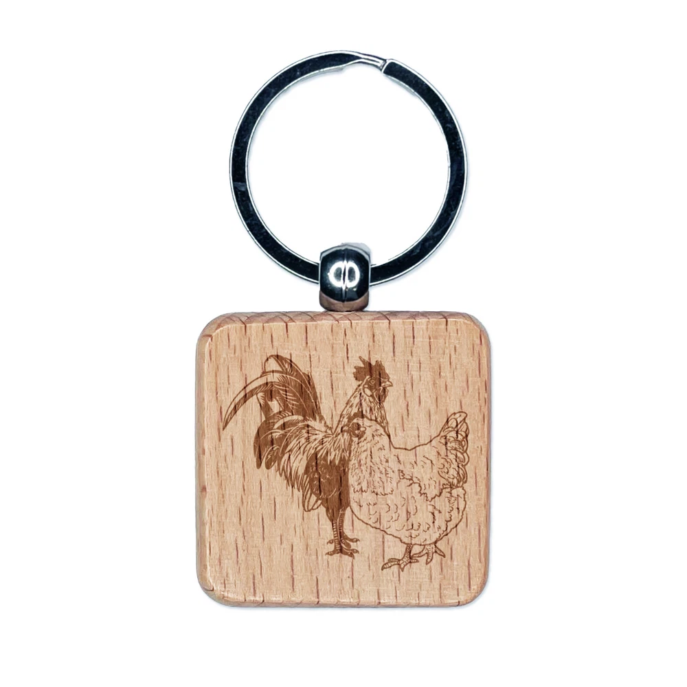 Llavero cuadrado de madera grabada para pareja de gallos y gallinas con etiqueta
