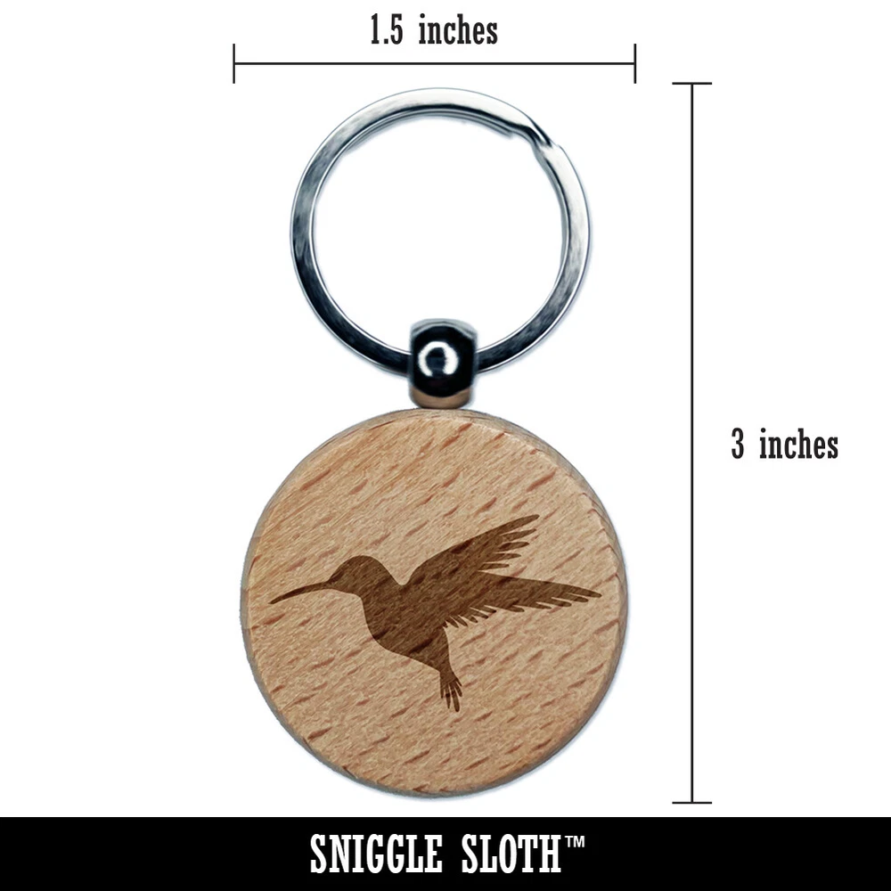 Llavero redondo silueta de colibrí grabado en madera con etiqueta