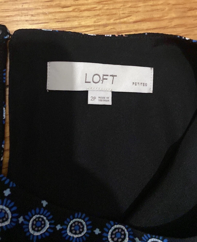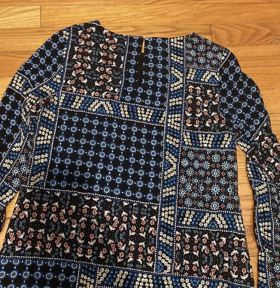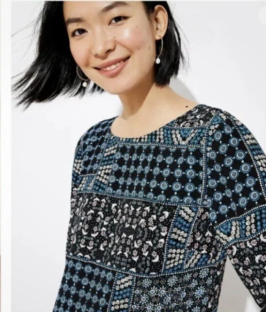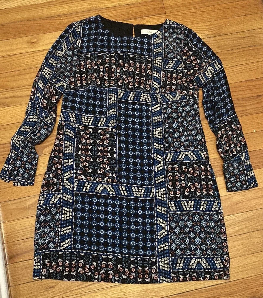 Loft Petites Black Blue Pink Patchwork Ditsy Floral Long Sleeve Dress Sz 2P