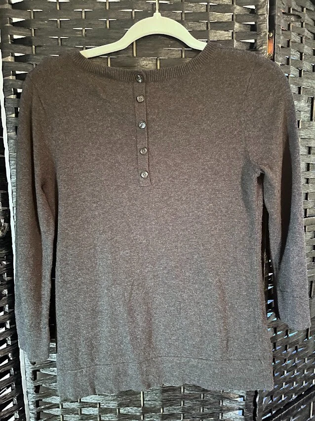 This Loft sweater in charcoal gray is a must-have for any woman's wardrobe. The 3/4 sleeves and crew neck make it perfect for any occasion, while the button-up back adds a touch of sophistication. Made of 100% cotton, it is both comfortable and stylish. The solid pattern and pullover style make it easy to pair with any outfit. This sweater is perfect for any woman looking for a versatile and stylish addition to their wardrobe.