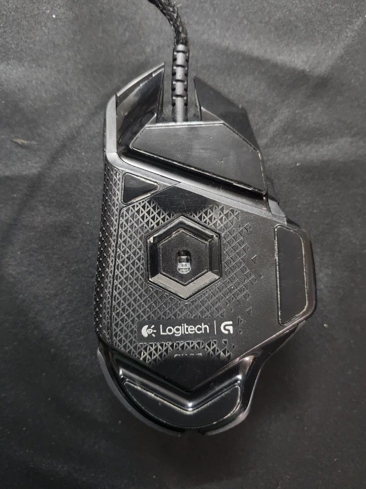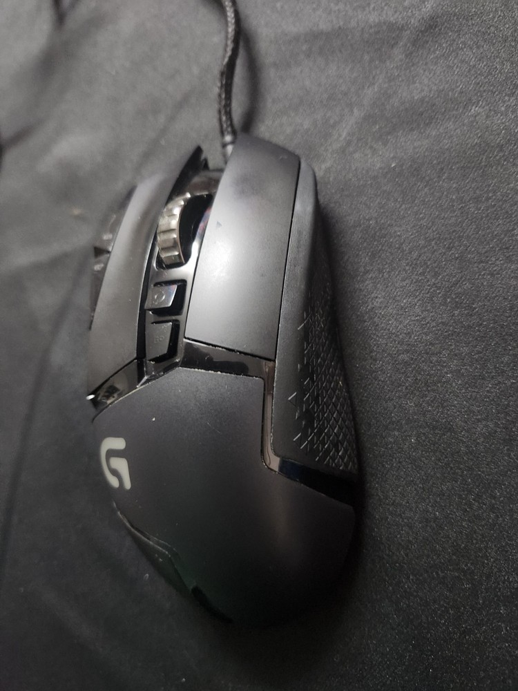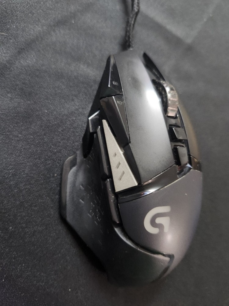 The Logitech G502 HERO is a black wired gaming mouse with a maximum DPI of 25600. It features programmable buttons, adjustable DPI, a scroll wheel, and adjustable weight. The mouse has a total of 10 buttons and uses optical tracking. The model is Logitech G502 HERO. This has been well used for a few years and then in a box for a few years. The mouse itself is fine with some cosmetic wear and tear. The wire casing is slightly scuffed, with part of the wire sticking out at one point. Product cleaned. No box or instructions.