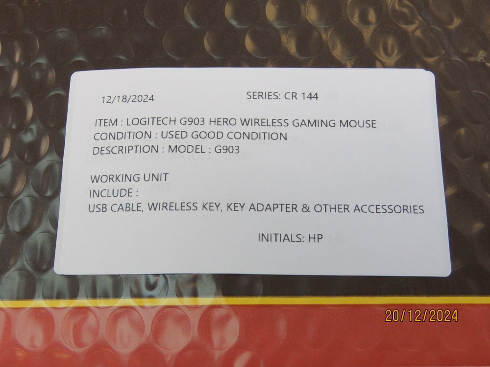 Logitech G903 LIGHTSPEED Wireless Gaming Mouse With Hero Sensor [CR144] Functional Condition: Tested and Functional. Cosmetic Condition: This is a Used Item and Normal Wear (Scuffs & Scratches) is Expected. Items included in this listing: Mouse USB Cable Wireless Key Key Adapter Side Buttons Items NOT included in this listing: N/A Thank you for Shopping with Us! ENJOY Free Shipping in USA & Low Cost Shipping to CANADA! Terms of Sale NOTE: Our Listings only include items as pictured - Please do not assume any item is included if its not pictured. We will try our best to picture all items included in this listing as well as its cosmetic condition. We Guarantee & Stand Behind our product and commitment to provide you with o nly Original, Branded, OEM & Genuine Products Shipping A complete and correct shipping address is essential. We cannot guarantee the shipping address can be changed after checkout. Sales Tax will be charged to all Canadian & USA Buyers. Combined shipping is not guaranteed. We are unable to change any content of your order based on the eBay checkout note or PayPal message. Customers with shipping addresses outside of the U.S.A and Canada are responsible for all duties and import taxes. Please contact your customs for information Bidding All items are accurately described and pictured. Please ensure you are consciously bidding on the items as described. Payment Payments are expected at the time of purchase or in case of Auctions, at the end of auctions. Payments are managed via eBay Managed Payments Contact Us Your positive feedbacks are extremely valuable to us. If you have any concerns about your order, please contact us through eBay message to resolve any issues before leaving a negative feedback or opening a dispute. We will reply within 24 Hours Return Policy All items are in used condition unless specified.