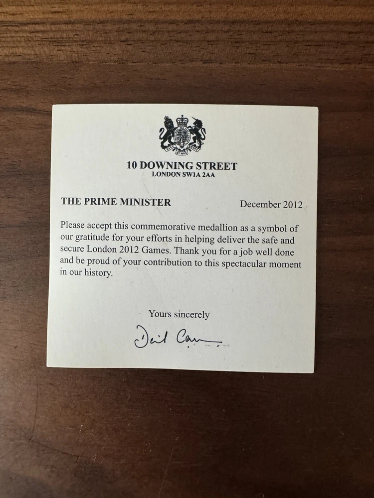 Presented to serving officers (including me) for the 2012 olympics. In excellent condition without any damage complete with Royal Mint case and note ‘signed’ by David Cameron (prime minister). This is an electronic/printed signature not a wet signature!