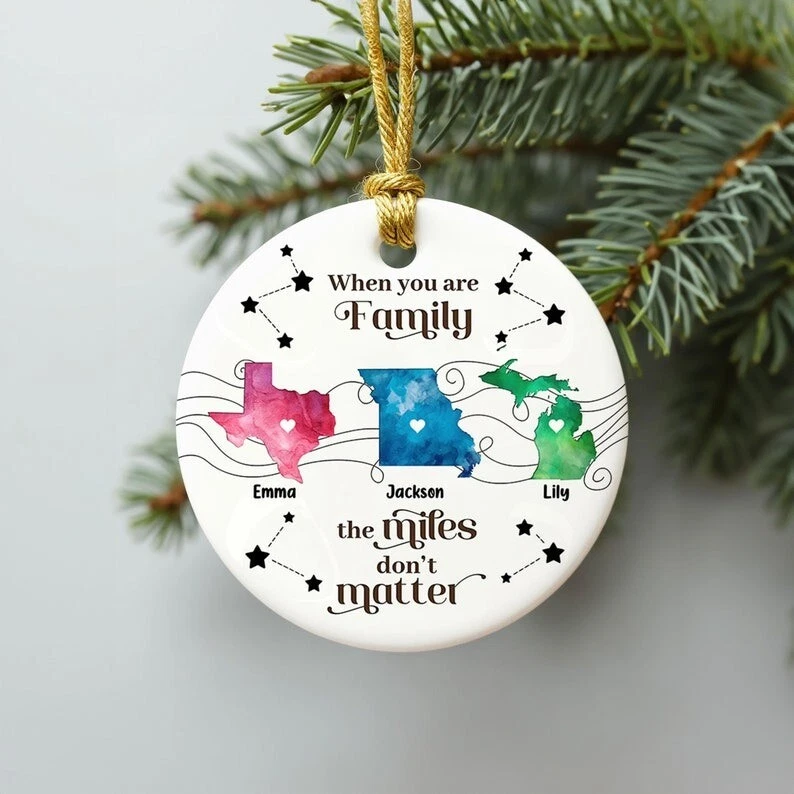 Long Distance Relationship Ornament, When You Are Family The Miles Don't Matter Ornament, Custom Family Friends Christmas Ornaments If you need to buy more, please inbox us We have two material options (Ceramic & MDF), please read the product description as below to choose your favorite options. MDF Ornaments 1-sided design. Print type: Sublimation printing. Crafted from durable MDF with a high-gloss plastic finish so your designs last a lifetime. Shapes: Round, star, heart and oval . Product Dimensions: Circle & Heart, 2.75” tall; Oval & Star, 3.25” tall. Ships with a festive gold cord for easy hanging. CERAMIC Ornaments 125" (3mm), 2.75" height (circle), thick high-quality porcelain One-sided print Hole for the hanging string Gold-toned string included Available in 4 shapes - Snowflake, Star, Heart and Circle The height of the hole can slightly deviate Shipping, Return and Refund Policy On average, merchandise is produced and shipped from our facility 2-4 business days after purchase. Standard Shipping: 5-7 working days for USA. Please contact us if you have any dissatisfaction with the item you buy so that we give you the solution. It is easier for us to handle your issue if you send us the proof like an image. We can replace another within 30 days without fee if the item is defective, damaged, or an error is made on our end.
