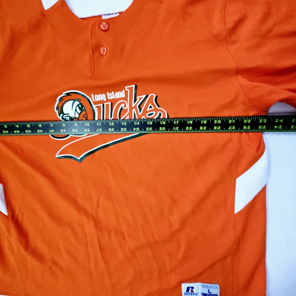 100% polyester jersey knit russell athletic dri power 1/4 button short sleeve baseball shirt. Long Island Ducks NY #26 trever bentoncourt pitcher. Shirt is in excellent clean condition no holes or tears. Sz Large Measures flat 19" across shoulders 23" pit to pit 30" Length