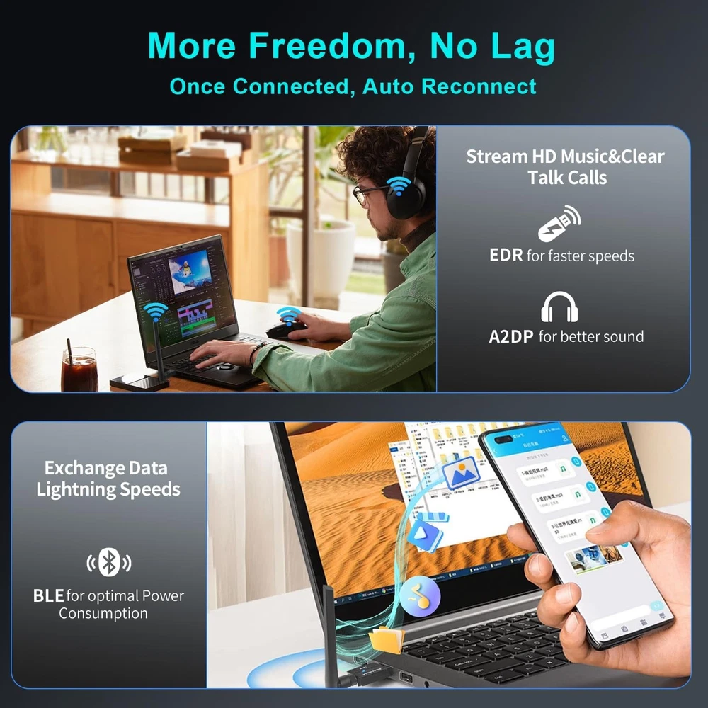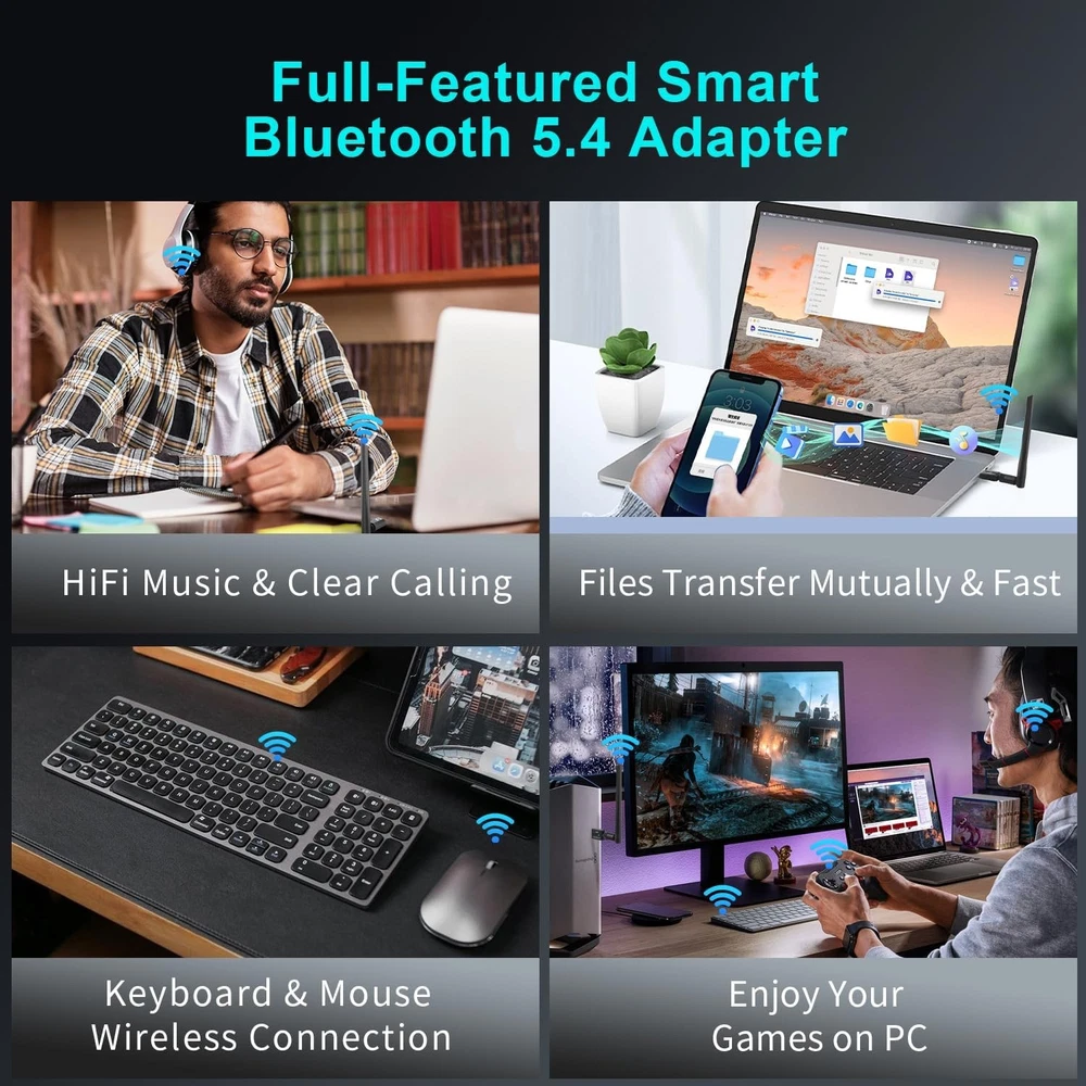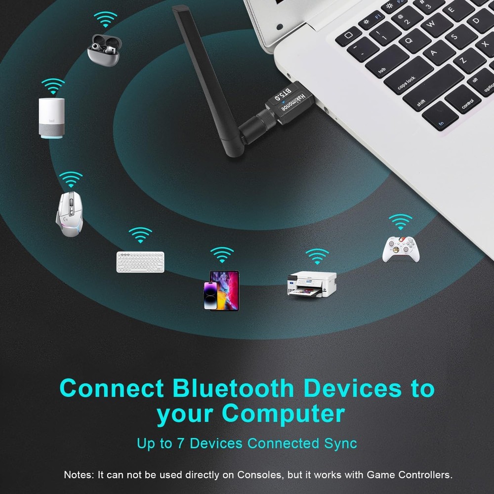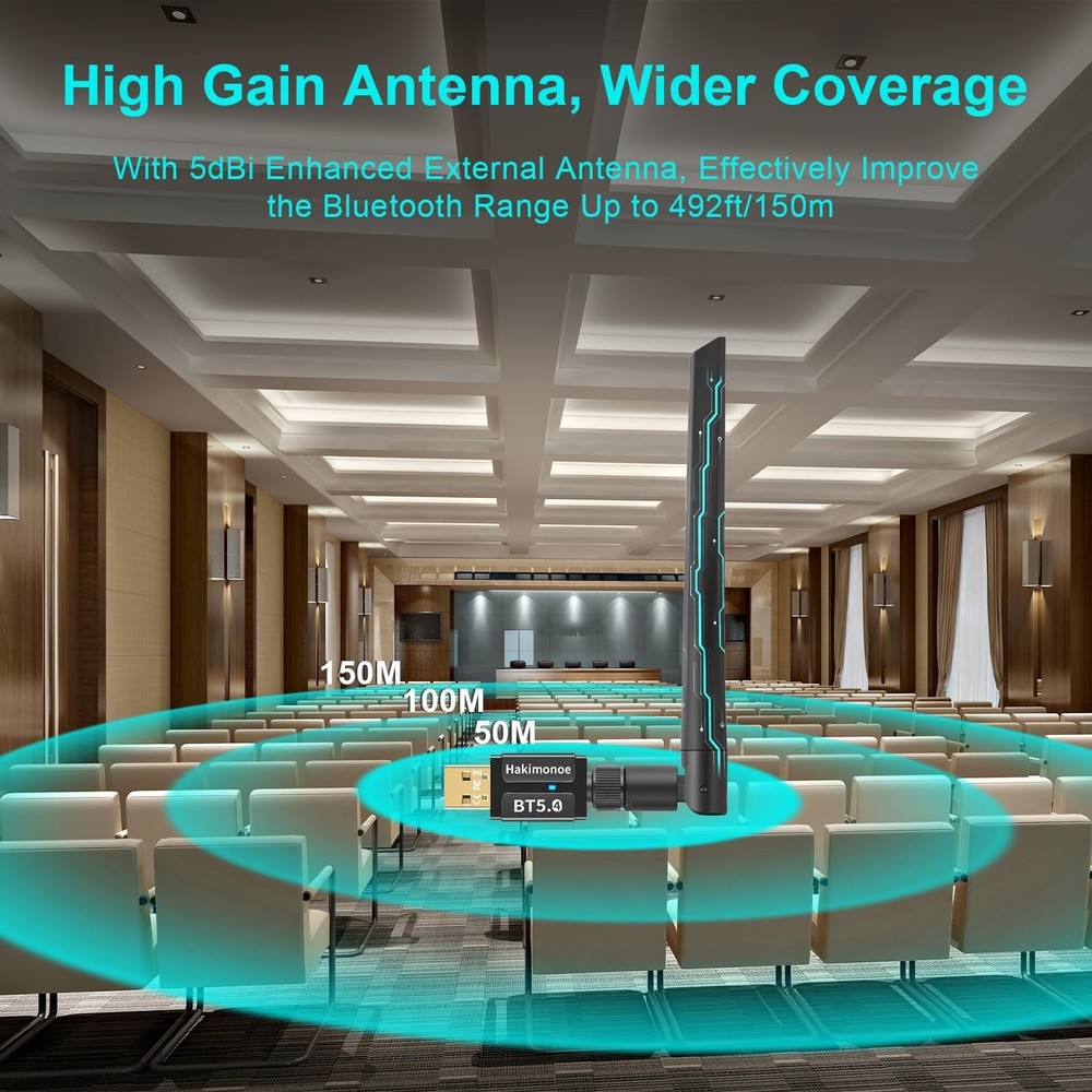 Long Range Bluetooth 5.4 Adapter for PC, Wireless USB Dongle w/ 5dBi Black Product Details Product Dimensions: 7.09 x 0.79 x 0.28 inches Item Weight: 0.635 ounces Item model number: BT548 Manufacturer: SHEN ZHEN XIN HUA TIAN TECHNOLOGY CO., LTD Language: English Brand: hakimonoe Hardware Interface: Bluetooth, Bluetooth 4.0, Bluetooth 5, USB, USB 2.0, USB 3.0 Color: Black Compatible Devices: Bluetooth Headphones / Headset / Earbuds / Speakers, Bluetooth Mouse / Keyboard, Bluetooth Smart Tablet / Printer / Cellphone, PS4 / PS5 / Bluetooth Controller, Not work with Game Consoles, Window 7/8.1/10/11 PC Laptop Desktop PC Computer Bluetooth Headphones / Headset / Earbuds / Speakers, Bluetooth Mouse / Keyboard, Bluetooth Smart Tablet / Printer / Cellphone, PS4 / PS5 / Bluetooth Controller, Not work with Game Consoles, Window 7/8.1/10/11 PC Laptop Desktop PC ComputerBluetooth Headphones / Headset / Earbuds / Speakers, Bluetooth Mouse / Keyboard, Bluetooth Smart Tablet / Printer / Cellphone, PS4 / PS5 / Bluetooth Controller, Not work with Game Consoles, Window 7/8.1/10/11 PC Laptop Desktop PC Computer See more Product Dimensions: 7.08"L x 0.78"W x 0.27"H Data Link Protocol: Bluetooth, USB Data Transfer Rate: 3 Megabits Per Second Item Weight: 18 Grams Long Range USB Bluetooth 5.4 Adapter for PC: The smart BT548 Bluetooth dongle can allow your Non-Bluetooth PC Laptop Desktop Computer to feature latest Bluetooth 5.4 function at once. Then you can enable your PC Laptop Desktop to pair & connect with Bluetooth headphones/headset/mouse/keyboard/printer/tablet to enjoy stereo, clear calling, wireless operation or files transfer freely. Plug and Play, Easy to Setup: The BT548 Bluetooth dongle for PC is plug and play for Windows 8.1, 10, and 11 (make sure your computer is connected to the internet); Supports Win7 (driver required for Win7 and could be downloaded). Notes: 1. The BT548 PC adapter is not compatible with Mac, TV, Car-Stereo or Windows 8 XP Vista. 2. BT548 Bluetooth adapter is not to be used directly on Game console, only for game controllers used on PC. 3. Two BT548 Bluetooth usb can be paired with each other. Upgraded 2024 Bluetooth 5.4 Technology, Better performance: BT548 Bluetooth adapter pc engineered with the latest Realtek Bluetooth 5.4 chipset supports dual mode (BR/EDR + BLE). Greatly improves the stability of the connection data transfer speed, reduces the possibility of 2.4GHz signal interruption and gets low power consumption. Can link BR/EDR and BLE at the same time, No delay, No loss and it is backward wide compatible with old Bluetooth 5.3/5.1/5.04.2/4.0/3.0/2.1/2.0/1.1. Farther Coverage, Up to 100m-150m Range: Our BT548 long range Bluetooth 5.4 adapter with Class 1 Radio RF technology is equipped with enhanced 5dBi detachable antenna, and the transmission range in the open area can reach up to 492ft/150m, Bluetooth connections are no longer affected by distance. Note: The operational range can be affected by walls, physical obstructions and wireless interference. Get Clear Calls, Enjoy Stereo Music: BT548 Bluetooth USB for PC/Laptop to pair with Bluetooth headphones or speakers for superior stereo music wireless streaming. Also, you have the ability to take Skype online calls using your headset mic and use the USB adapter to transfer data files to / from mobile phones / tablets. Do as you please, be free and unrestrained. Faster Speed, More Stable: With the upgraded Bluetooth 5.4 technology, this usb Bluetooth adapter for pc will get faster data transfer speeds of up to full 3 Mbps, which is double what old Bluetooth supports. The Bluetooth 5.4 function improves the stability of the connection, no lag, no loss. Up to 7 Devices Sync Connected: BT548 PC Bluetooth adapter supports up to 7 different types of devices to be connected and can work together at the same time without interfering with each other, Which means that you can listen to high-quality music while using the keyboard mouse or other devices. But If Bluetooth audio devices of the same type (such as speakers/headphones) are connected, only one of them can play music.