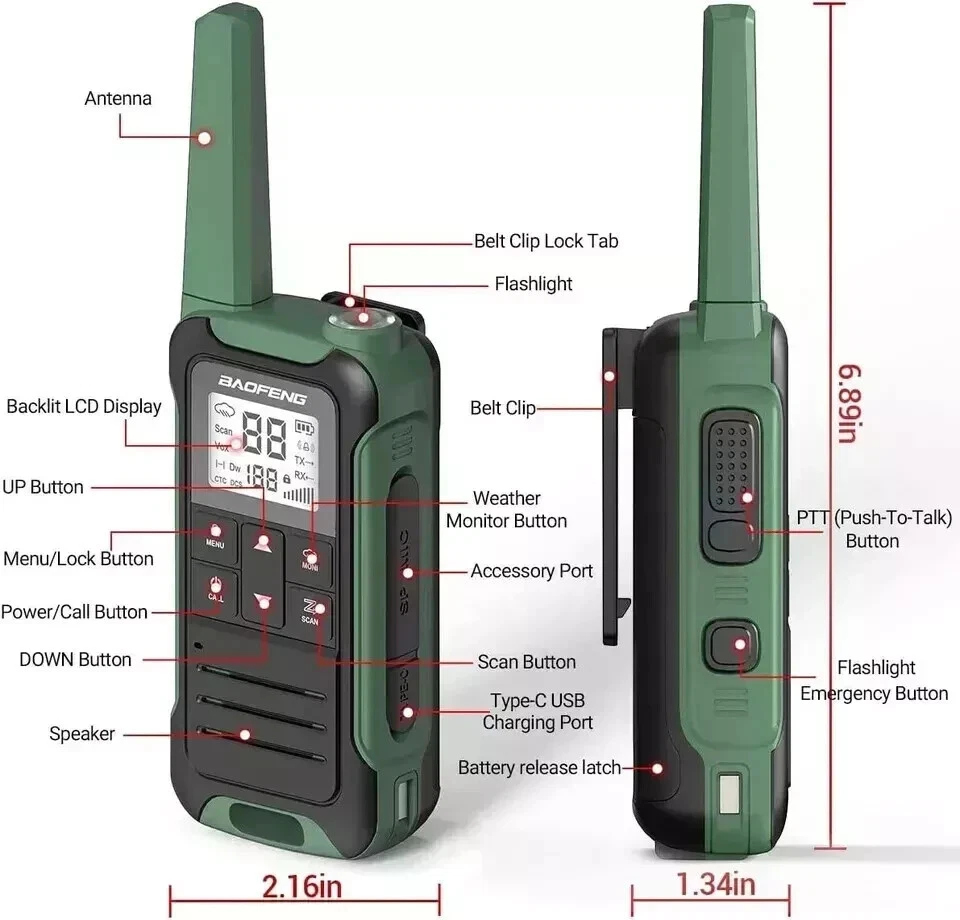 Long Range Walkie Talkie 2 Set 50 Mile Two Way Radio Charge Headset Waterproof About this item: 【Two way radio】FCC ID: 2AJGM-F22. Baofeng F22 have FRS 22 channels, 50 CTCSS privacy codes and 105 DCS privilege codes.You can set your own main channel and privacy code without worrying about being disturbed.When the walkies talkies on the same channel and privacy code,you can communicate with other brands FRS radios. 【Multi-function】 The large flashlight can meet your night lighting, the portable frs two-way radio has weather alarm, which is suitable for your outdoor travel, and also has 22 channels, 12 NOAA channels, dual monitoring mode, channel scanning, 155 privacy codes, call function and 8 ring tone options, VOX hands-free function and HD audio quality, as well as Keypad Lock, Backlit LCD Display, Low Battery Audible Alert, 2Pin Kenwood headset jack. 【NOAA Weather Alert】 The adult walkie talkie supports NOAA weather service. It can scan 12 NOAA Weather channels. When you turn on the weather alarm function, the two-way radio will give an alarm if there is a risk of bad weather. Gives you plenty of time to deal with disasters such as Tornadoes, Hurricanes, Thunderstorms, Floods, Earthquakes, etc. This is a necessity for life safety. 【Replaceable battery】 It is powered by three AA batteries (batteries are not included in the package). The battery can be replaced at any time. The supplementary power supply can be easily carried to ensure that it will not be in a power-off state. (Note: Alkaline batteries can only be used for replacement and cannot be recharged. NiMH batteries can be recharged and recycled). 【Multi-scene application】 Walkie talkies long range can reach 3 miles in open areas.If there are buildings, the working range will be reduced.Two way radio for adults, palm-sized, strong material and resistant to falling, rain-proof, very suitable for various application scenarios such as: road trip,warehouse,cruise ship,outdoor picnic, camping, riding, hotel management, warehouse, building construction, restaurant, school Playground and church. 【 What you get 】Package contains (walkie talkie, belt clip, hand strap, ) X 2 and user manualX1.Easy to operate, suitable for novices, and provide technical guidance. All day customer service replies to ensure your purchase enjoyment. The Walkie Talkies is super suitable for hiking, biking, camping trip, road trip, cruise ship and outdoor adventures, etc. They can Be Used in Some Harsh Environments and Achieve Communication Security for People. Baofeng Professional Walike Talkies are Exquisite and Compact in Hardware Design, with Outstanding Texture, Ruggedness and Durability, and The Voice of the Call is Clear and Sensitive, and The Range is very Powerful to Achieve the Industry Customers' Fine Command and Dispatch Effect. THANKS FOR SHOPPING WITH US!!