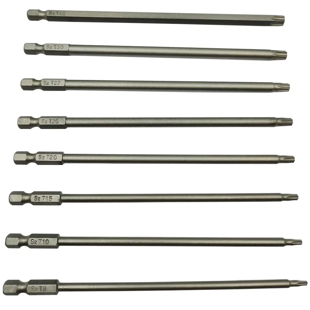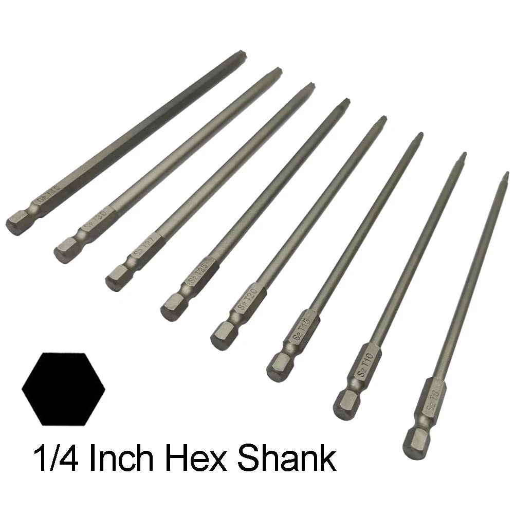 ✔【8 Size Torx Screwdriver Bits】T8, T10, T15, T20, T25, T27, T30, T40, 8 in 1 Professional Size long torx security driver bits set can meet your different needs. Size is clearly engraved on the shank for easy identification. ✔ 【Widely Application】1/4” inch hex shank, and 6 inch (150mm) length. Can be used with electric screwdriver, manual screwdriver, electric drill, group general tools, air drill and other any standard bit holders. ✔【S2 High Quality Steel】Made of S2 high quality shock-resisting tool steel, a hard and abrasion-resistant alloy metal. Torx head bits surface for steel material color,from inside to outside are the same. ✔【Magnetizable Head】Magnetizable torx security screwdriver bar(New Bits with Weak Magnetic). After Magnetized with a magnet it would with a strong magnetic, can suck the screws easily when used it. ✔【Exquisite Workmanship】This torx security tamper proof star bit set, exquisite workmanship, each edge can be accurately locked screws, no damage to the screw, and the screwdriver head.Such a practical aid in many situations.