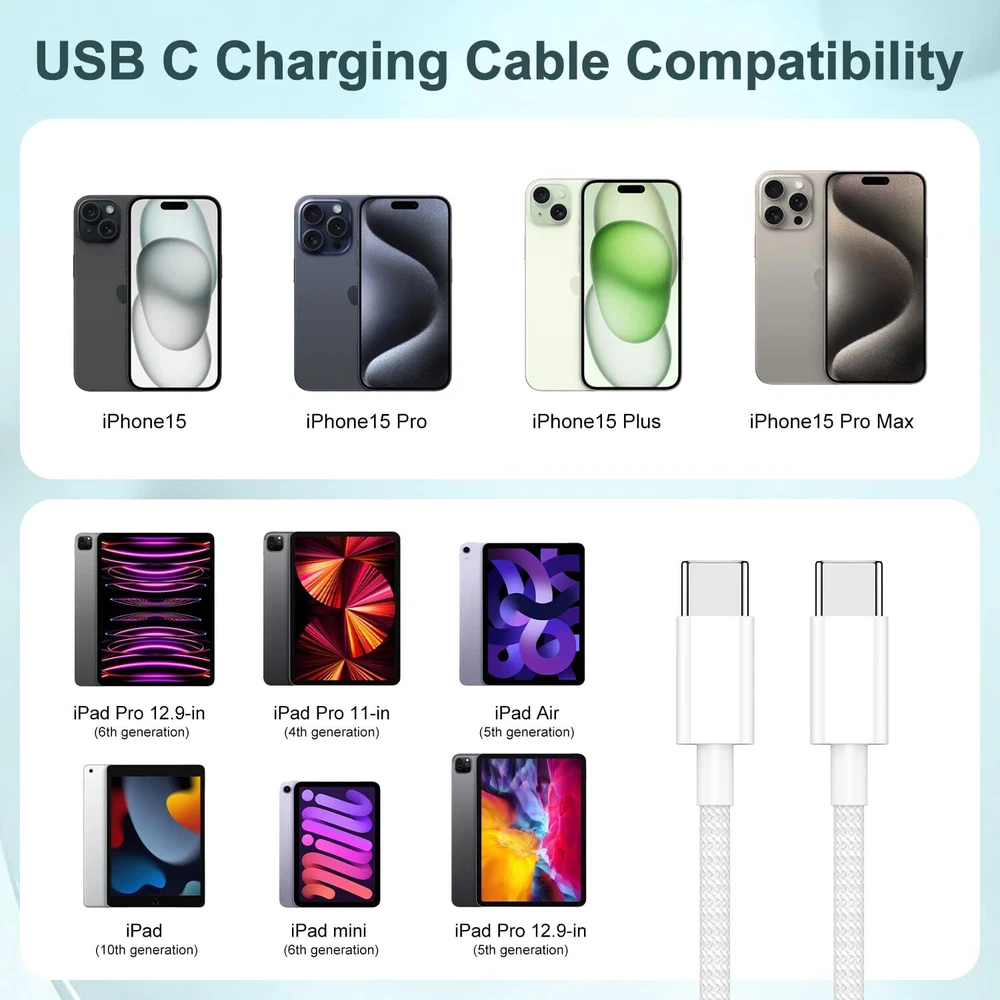 Long USB C to C Fast Charging Cable 6ft, 60W Type C to C Charger Cord for Apple iPhone 15 Plus/15 Pro Max, MacBook Pro 2021/2020/2019/2018,iPad 12.9/11 inch/Mini/Air 5/4,Samsung Galaxy S23+/S23 Ultra 【iPhone 15 60W Fast Charging cable】This iphone 15 pro usb c to type c cable support PD3.0/QC3.0/QC4.0 fast charging up to 60W charging. suit with USB-C adapters such as 18W/30W/45W/60W. charges iPhone 15,USB C Phone from to 60% within about 35 minutes, Improve iPhone 15 series charging efficiency and save time. and data transfer speeds up to 480Mbps (200 songs synced per minute) compatible with iPhone 15,Samsung,iPad Air Mini Pro,Macbook and More. 【many Protection USB C Port】USB to USB C Cable has electronic safety certifications that comply with appropriate standards, it built-in laser welding technology, which ensure the metal part won't break. which increases charging speed. Overheating and overcharging protection function to ensure the safety of you and your devi ce while syncing and charging.The copper core part is reinforced with UV glue to prevent the solder joints from falling off. 【Durable and Stable】Premium Nylon materials adding additional durability and tangle-free, can bear 20000+ bending test. Strong military fiber make it flexible.Unique laser welding technology make the connector prevent from broken.The USB C port through Load-bearing about 13KG test which longer service life and will break.Unique insulation and shielding allows for easier and safer charging and syncing. 【Right for ALL Your USB C Devices】This is the USB-C to USB-C cable Not the USB-C to USB-A cable, Compatible with virtually all USB-C devices including phones, tablets, and laptops. Such as iPhone 15/15 Plus/15 Pro/15 Pro Max, Samsung Galaxy S23/S22/S21+/S21/S20/ S20+/ S20 Ultra/ Note 10, MacBook Air/Pro 13'', iPad Pro 12.9-in.(6th ),iPad Pro 11-in.(4th ),iPad Air (5th ),iPad (10th generation),iPad mini (6th ) and more. 【What you get】3 pieces iPhone 15 USB C cables,If you have any questions about our iPhone cable, please feel free to contact us. We will give you a satisfactory answer to prove our emphasis on quality. You can buy with confidence. 【iPhone 15 60W Fast Charging cable】This iphone 15 pro usb c to type c cable support PD3.0/QC3.0/QC4.0 fast charging up to 60W charging. suit with USB-C adapters such as 18W/30W/45W/60W. charges iPhone 15,USB C Phone from to 60% within about 35 minutes, Improve iPhone 15 series charging efficiency and save time. and data transfer speeds up to 480Mbps (200 songs synced per minute) compatible with iPhone 15,Samsung,iPad Air Mini Pro,Macbook and More. 【many Protection USB C Port】USB to USB C Cable has electronic safety certifications that comply with appropriate standards, it built-in laser welding technology, which ensure the metal part won't break. which increases charging speed. Overheating and overcharging protection function to ensure the safety of you and your devi ce while syncing and charging.The copper core part is reinforced with UV glue to prevent the solder joints from falling off. 【Durable and Stable】Premium Nylon materials adding additional durability and tangle-free, can bear 20000+ bending test. Strong military fiber make it flexible.Unique laser welding technology make the connector prevent from broken.The USB C port through Load-bearing about 13KG test which longer service life and will break.Unique insulation and shielding allows for easier and safer charging and syncing. 【Right for ALL Your USB C Devices】This is the USB-C to USB-C cable Not the USB-C to USB-A cable, Compatible with virtually all USB-C devices including phones, tablets, and laptops. Such as iPhone 15/15 Plus/15 Pro/15 Pro Max, Samsung Galaxy S23/S22/S21+/S21/S20/ S20+/ S20 Ultra/ Note 10, MacBook Air/Pro 13'', iPad Pro 12.9-in.(6th ),iPad Pro 11-in.(4th ),iPad Air (5th ),iPad (10th generation),iPad mini (6th ) and more. 【What you get】3 pieces iPhone 15 USB C cables,If you have any questions about our iPhone cable, please feel free to contact us. We will give you a satisfactory answer to prove our emphasis on quality. You can buy with confidence. Shipping from the USA All of our products are shipped from the USA, ensuring quick delivery to your destination. Payment We offer the following payment methods: PayPal, credit card, bank transfer, and eBay's secure payment system. Free Shipping & Free Returns Shipping within the USA is FREE. Additionally, any return is absolutely free for you. Risk-Free Purchase You have the option to return an item within 30 days without any justification. We cover the return shipping costs! Fast Shipping We ship immediately upon receipt of payment. Generally, the package is delivered within 2-3 days in the USA. If it takes longer, we will contact you. Quality and Costs Made in Europe, USA, China No customs fees or additional charges Total satisfaction guarantee Invoice with declared VAT available upon request in .pdf format Feedback Your feedback is very important to us. After you pay for your purchase, you will automatically receive positive feedback from us.