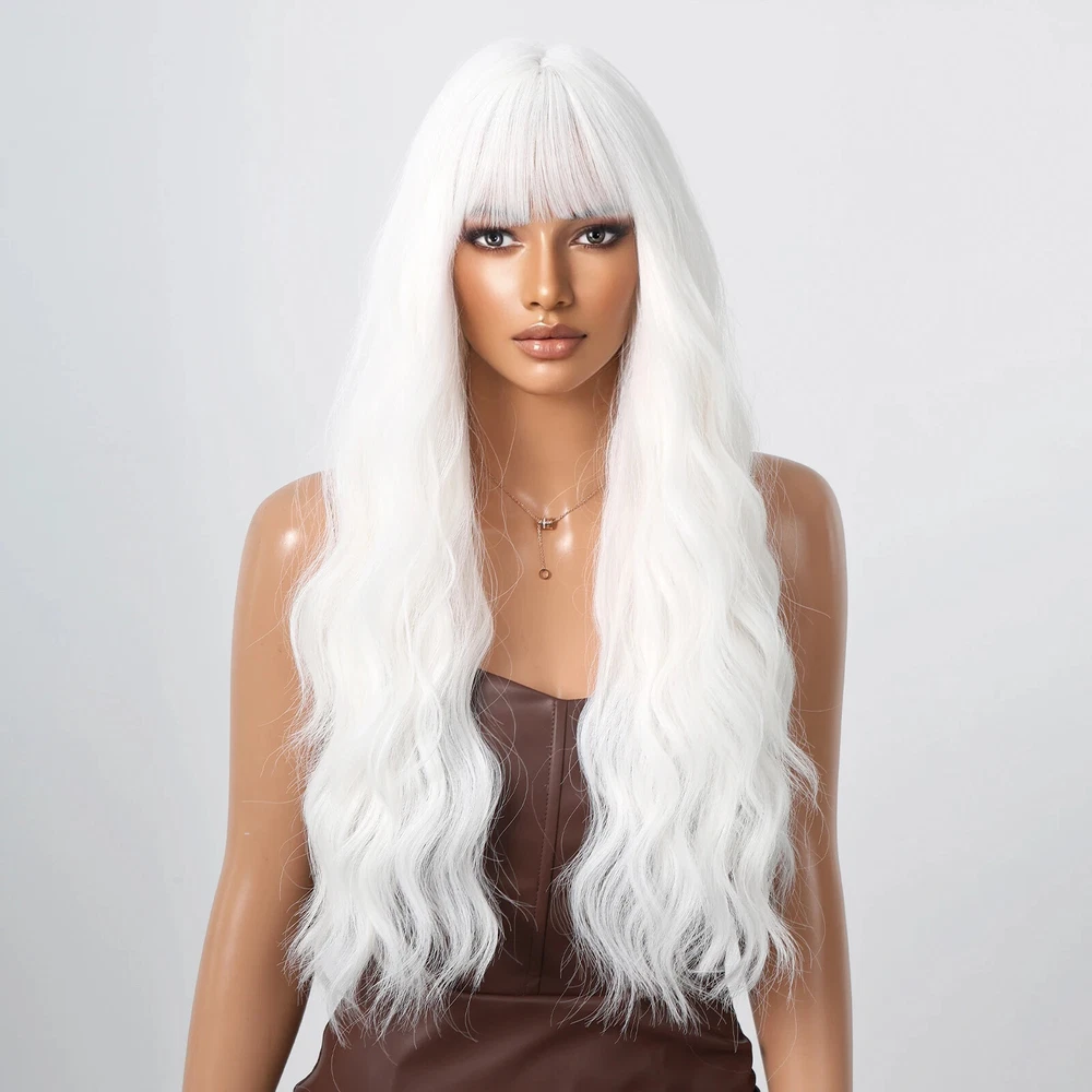 Department:WomenItem Length:LOngDensity:130%Origin:Mainland ChinaFeature 1:High Temperature Synthetic WigHair Origin:SyntheticFeatures:Heat ResistantBrand:UnbrandedType:WigItems per Package:1 Piece OnlyMaterial Grade:High Temperature FiberFeature 4:Long Water Wavy WigTexture:WavyFeature 3:Cosplay Party Daily Wedding/ChristmasFeature:CosplayFeature 5:White Wig With Bangs