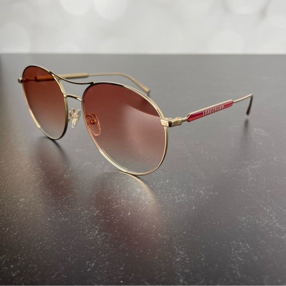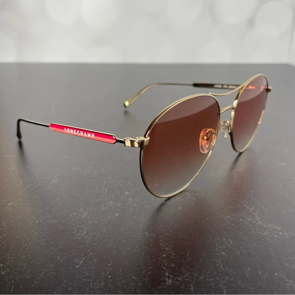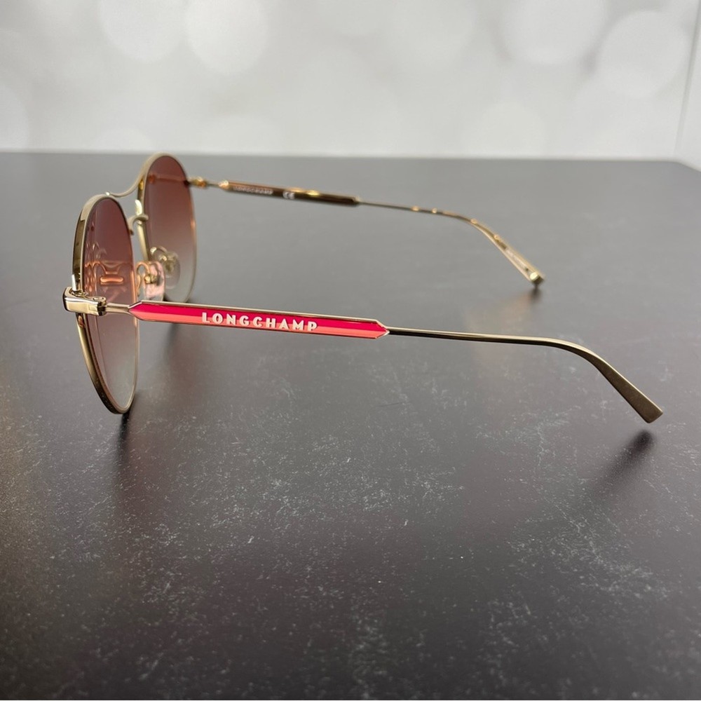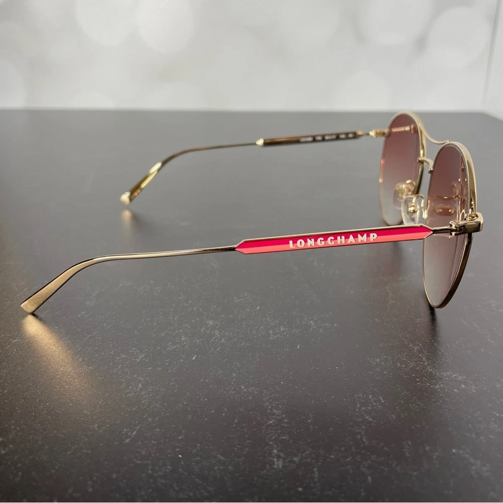 New without tags Longchamp LO133S 770 Rose Gold Oval Sunglasses Metal full rim frame Gradient red lens Pilot style Manufacturer Marchon UV Protection Category 2 Women’s Size 59-17-145 *Comes with case & cleaning cloth*
