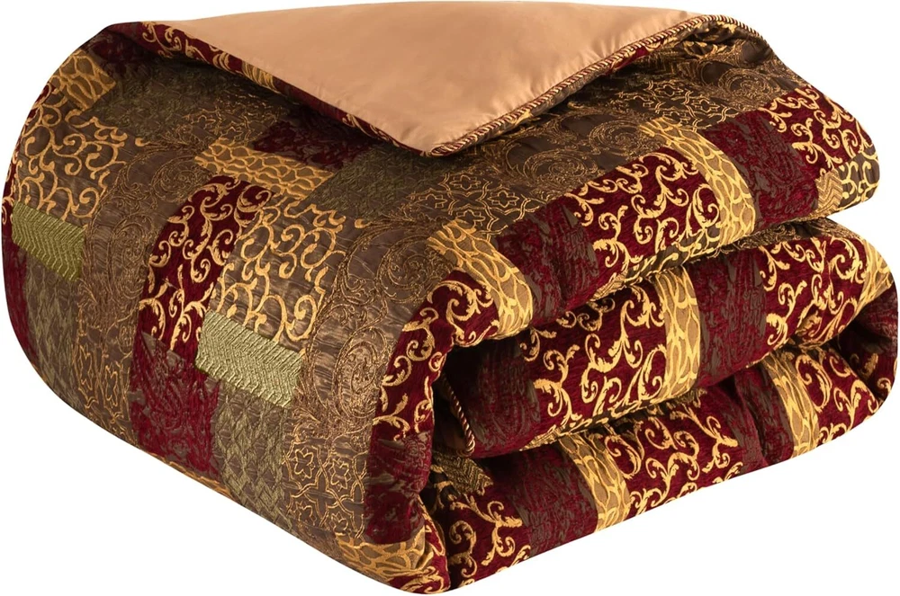 Loom and Mill 9-Piece Jacquard Comforter Set, Luxury Traditional Patchwork Comforter Queen Sets, Ultra Soft Bedding with Euro Shams, Bedskirt, Filled Decorative Pillow for Home Bedroom (Loong, Queen) Item Description About this item Synthetic Fiber DRY CLEAN ONLY: Made of high quality chenille fabric and advanced synthetic fiber, our luxury textured Queen Comforter Set is soft, skin-friendly, breathable and comfortable. With down alternative fill, suitable for all year round. GORGEOUS COMFORTER SETS: This Luxurious Patchwork Christmas Jacquard Comforter Set features an excellent combination of paisley, floral, damask and diamond patterns, the impressive traditional design imbues this beautiful ornate bedding set full of elegance, creating a unique look to the bedroom. 9-PIECE SET: 1 Queen Comforter(92”x96”), 2 Standard Shams(20”x26”), 1 Bed Skirt(60”x80” with 18” drop), 2 Euro Shams(26”x26"), 2 Decorative Pillows with PP filling(18”x18"), 1 High Pick Embroidered Pillow(13”x13”) TOP WORKMANSHIP: Combined with the weaving process and hand-made crafts, you can feel the great quality from every neat and tight stitching. The superb rolling rope edging and 300d high-density yarn count make this Queen Comforter Bedding Set more refined and durable. Loom and Mill Comforter Bed in a Bag set is made with strict quality control standards, and we are so confident you will love our products. If you have any questions, please feel free to contact us, we are willing to assist you. › See more product details Made of traditional chenille damask fabric, this 9-piece comforter set contains 8 different patterns, rich in color. We used two-color rolling rope for hemming sewing, make this bedding set more beautiful and durable. The decorative pillow is carefully engineered with beads and tassels, which look smart and delicate. This luxury bedding set comes with 3 different styles of decorative pillows, 1 logo pillow, 1 fake fur pillow and 1 square pillow with tassels, all of them are filled with fluffy PP. The bed skirt has a decorative stripe running vertically and a 18" drop, good drapability. 2 Standard Shams (20 "x 26") in traditional patchwork style. 2 Euro Shams (26 "x 26") in four-leaf clover pattern. Payment We accept payment only through PAYPAL Shipping We ship products worldwide through standard express courier service, it will reach within 7 to 10 days to abroad buyers, we ship the product after recieved clear payment and give full information about shipment to the buyer Return We accept product return within 7 to 21 days from delivery date but product should be in original position and not in damaged condition,the return shipping charges will be buyer responsibility