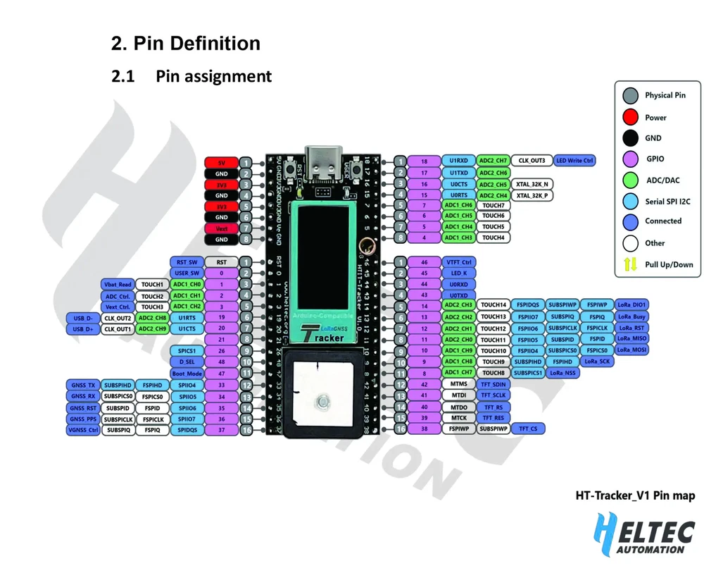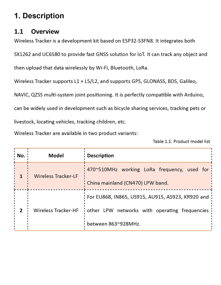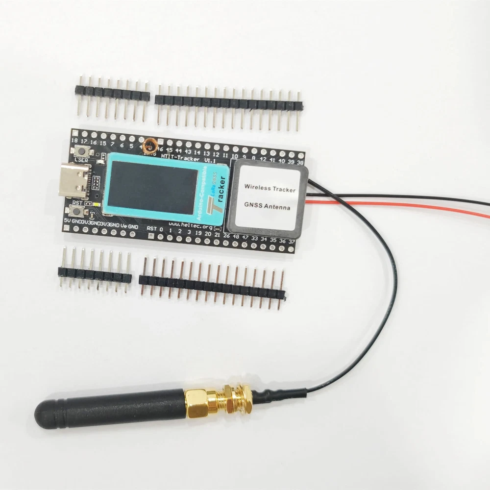 Tips: The product in this link defaults to 'no welding of pins'. If you need to weld before shipping, please contact customer service ,we will arrange it for you! Wireless Tracker is a development kit based on ESP32-S3FN8. It integrates both SX1262 and UC6580 to provide fast GNSS solution for IoT. It can track any object and then upload that data wirelessly by Wi-Fi, Bluetooth, LoRa. Wireless Tracker supports L1 + L5/L2, and supports GPS, GLONASS, BDS, Galileo, NAVIC, QZSS multi-system joint positioning. It is perfectly compatible with Arduino, can be widely used in development such as bicycle sharing services, tracking pets or livestock, locating vehicles, tracking children, etc. Wireless Tracker is a part of the “Heltec LoRa“ series, with the following features: Include glue rod antenna(IPEX-1); Without battery; Include SH1.25 x 2 battery connector. ESP32-S3FN8+SX1262+UC6580 Chipset, supports Wi-Fi, LoRa, Bluetooth, GNSS. Low power design of dual-frequency multi-system based on 22nm technology. Supports L1 + L5/L2, supports GPS, GLONASS, BDS, Galileo, NAVIC, QZSS multi-system joint positioning. Type-C USB interface with a complete voltage regulator, ESD protection, short circuit protection, RF shielding, and other protection measures. Onboard SH1.25-2 battery interface, integrated lithium battery management system (charge and discharge management, overcharge protection, battery power detection, USB / battery power automatic switching). Onboard Wi-Fi, Bluetooth dedicated 2.4GHz metal spring antenna, reserved IPEX (U.FL) interface for LoRa and GNSS use. Onboard 0.96-inch 128*64 dot matrix OLED display, which can be used to display debugging information, battery power, and other information. Support the Arduino development environment. Parameter: